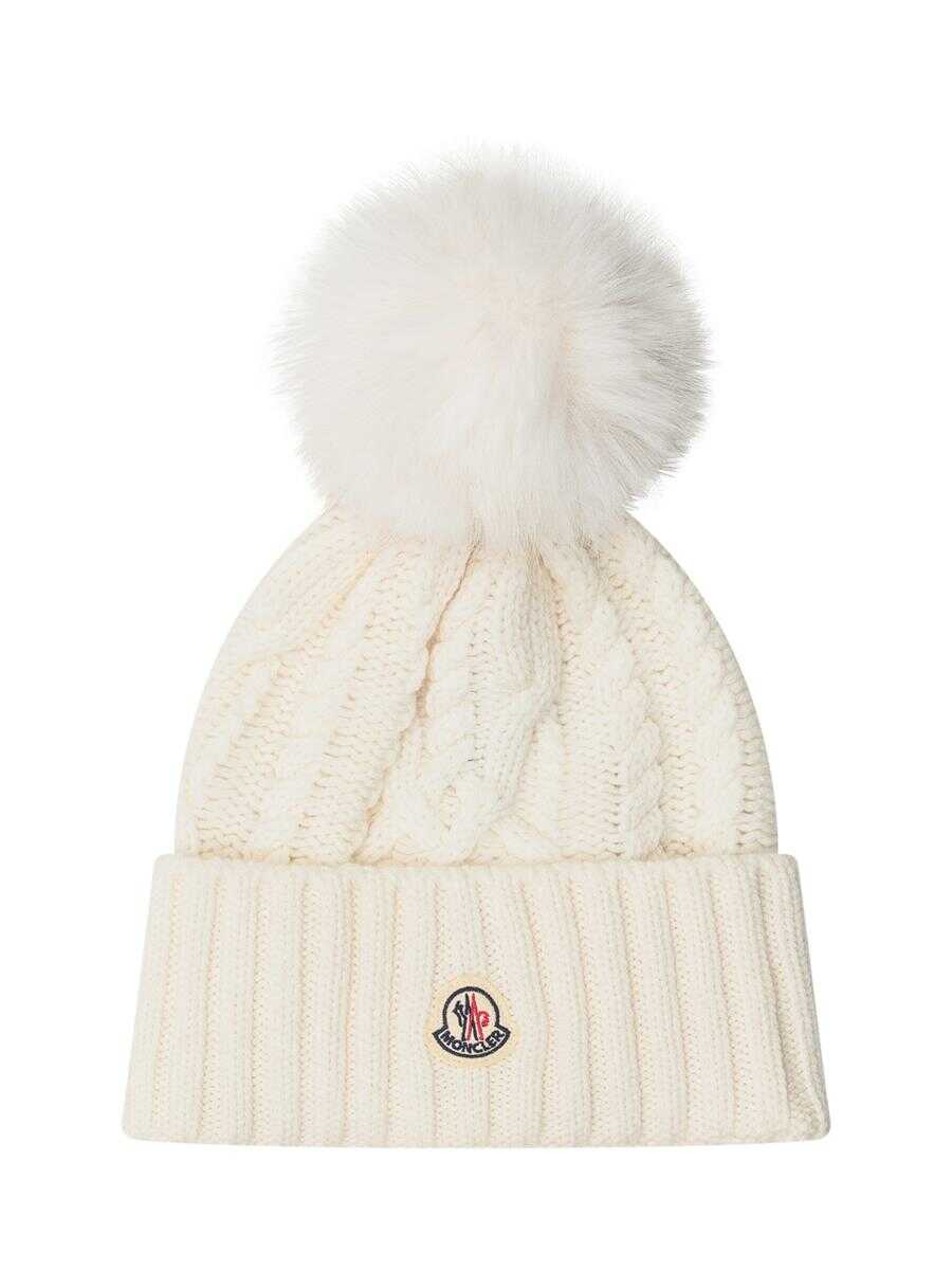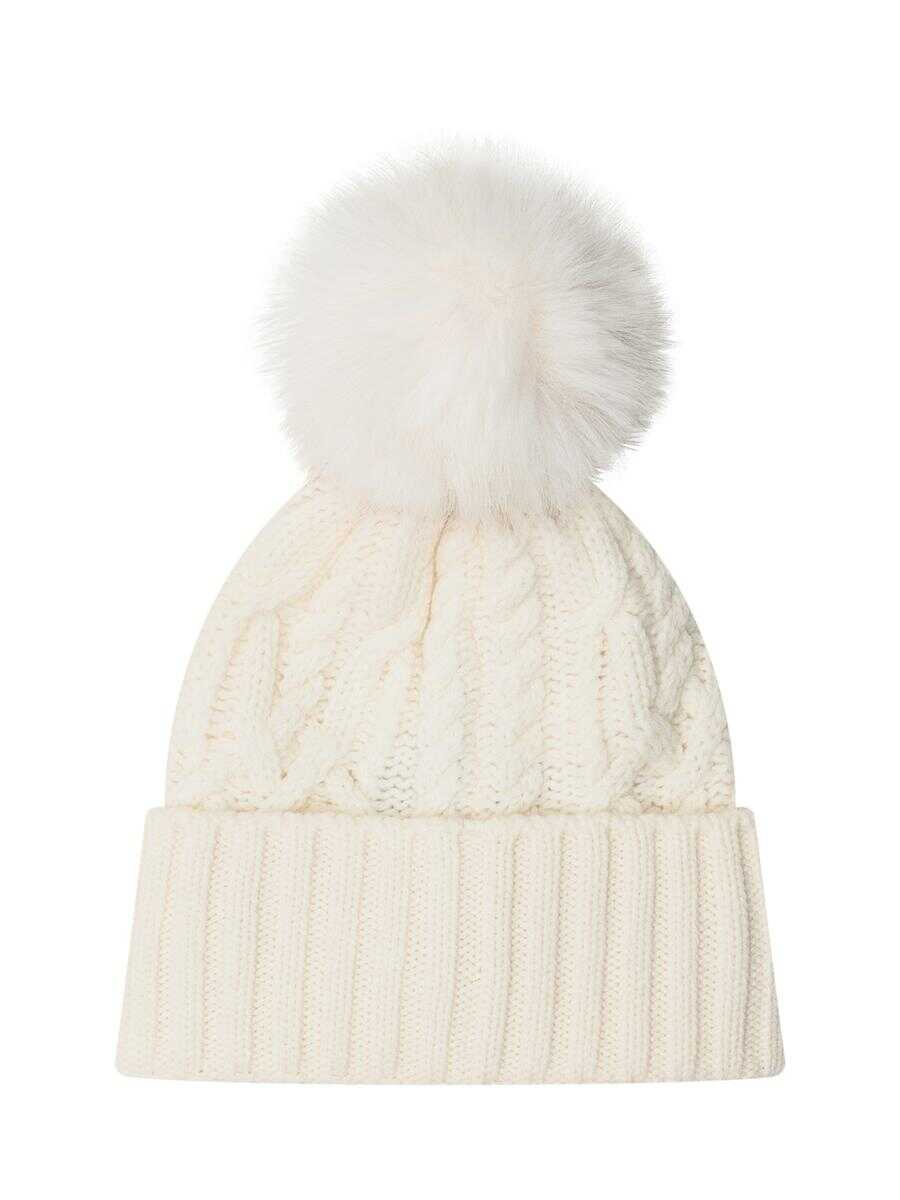 Moncler hat in white woven wool with maxi fur pompoms.