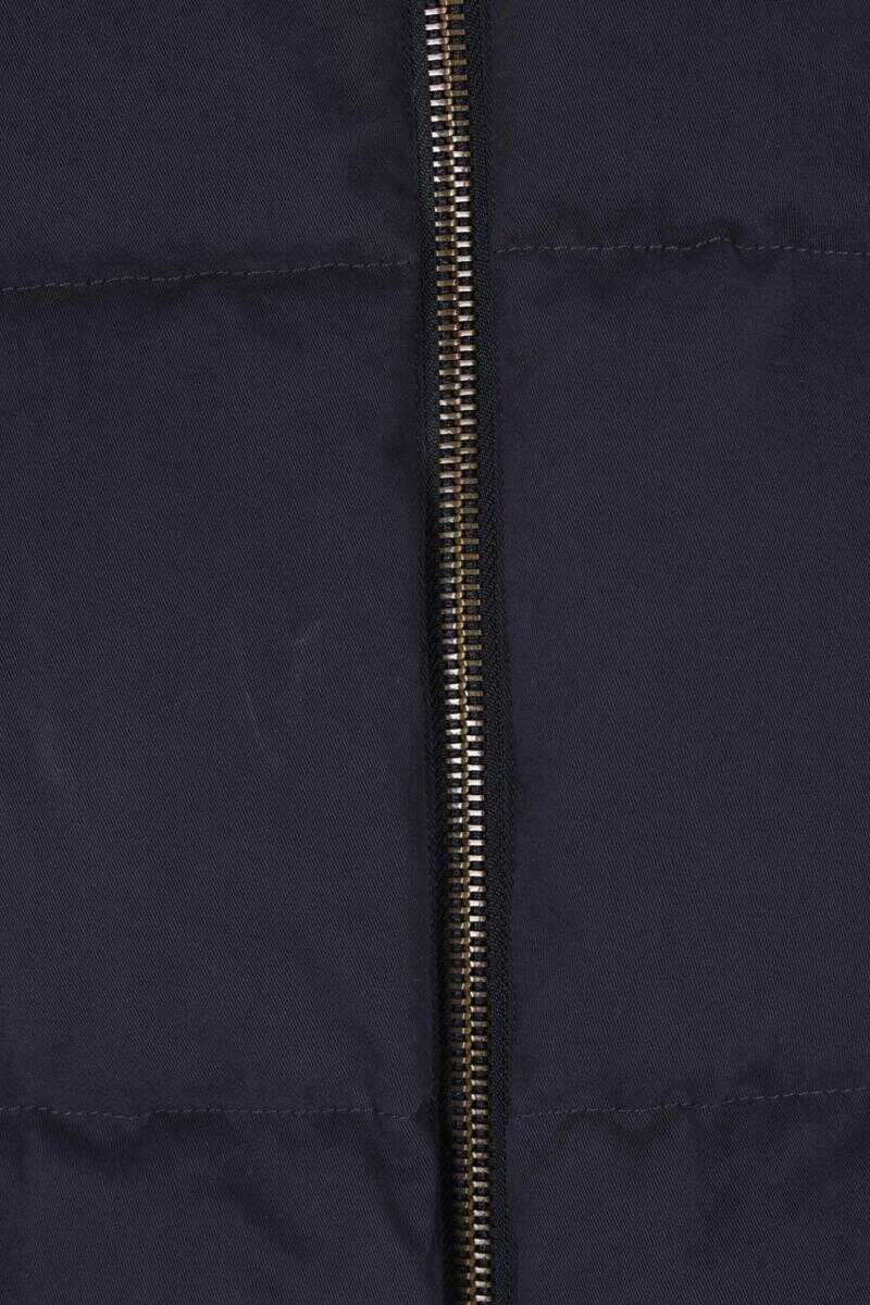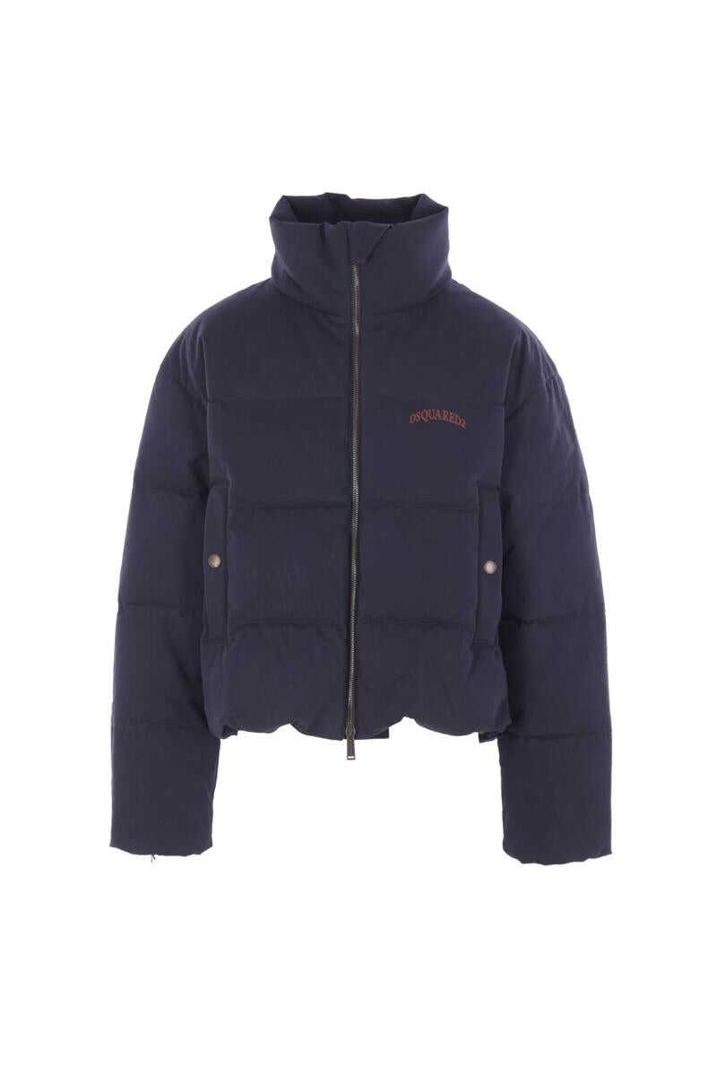 Dsquared2 down jacket crafted from blue cotton twill with a logo print on the chest. Featuring a high collar, double-slider zip closure, welt pockets, long sleeves, and elasticated trims. The interior is lined with printed cotton.