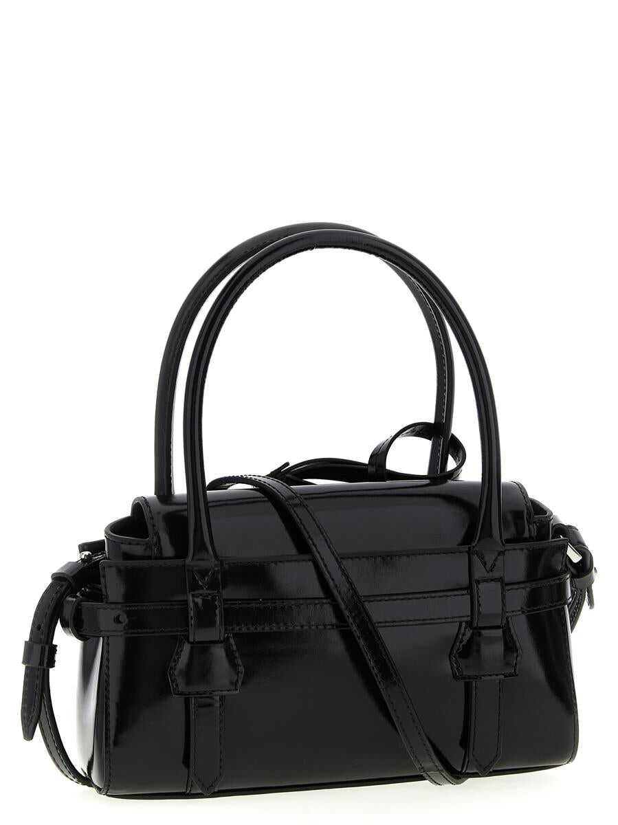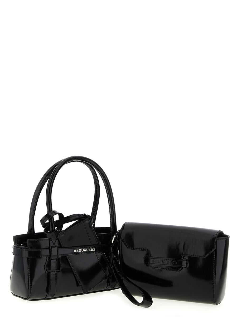 'Twin Mini' patent leather handbag, front metal lettering logo, inner snap button closure, double fixed handle, adjustable and removable shoulder strap, removable inner clutch bag with magnetic flap closure and wrist handle, removable coin purse