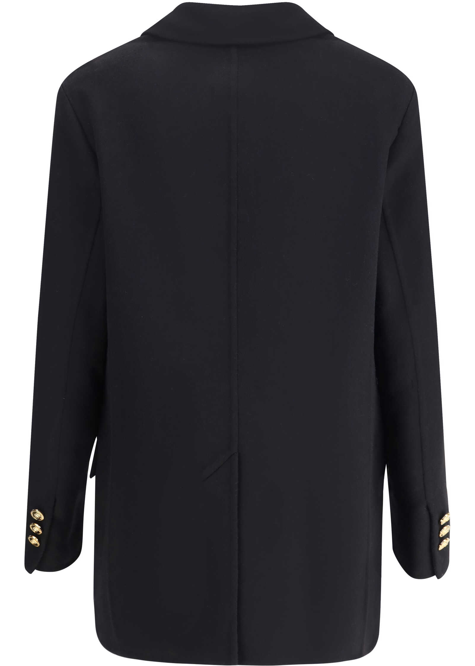 The Double-breasted Coat in wool and cashmere blend by Versace combines sartorial elegance with iconic details. The notched lapel, long sleeves, and front patch pockets enhance the coat’s classic lines, while the Safety Pin accessory and Medusa buttons add a distinctive character. Buttoned cuffs and the rear vent complete the design, perfectly balancing style and functionality.