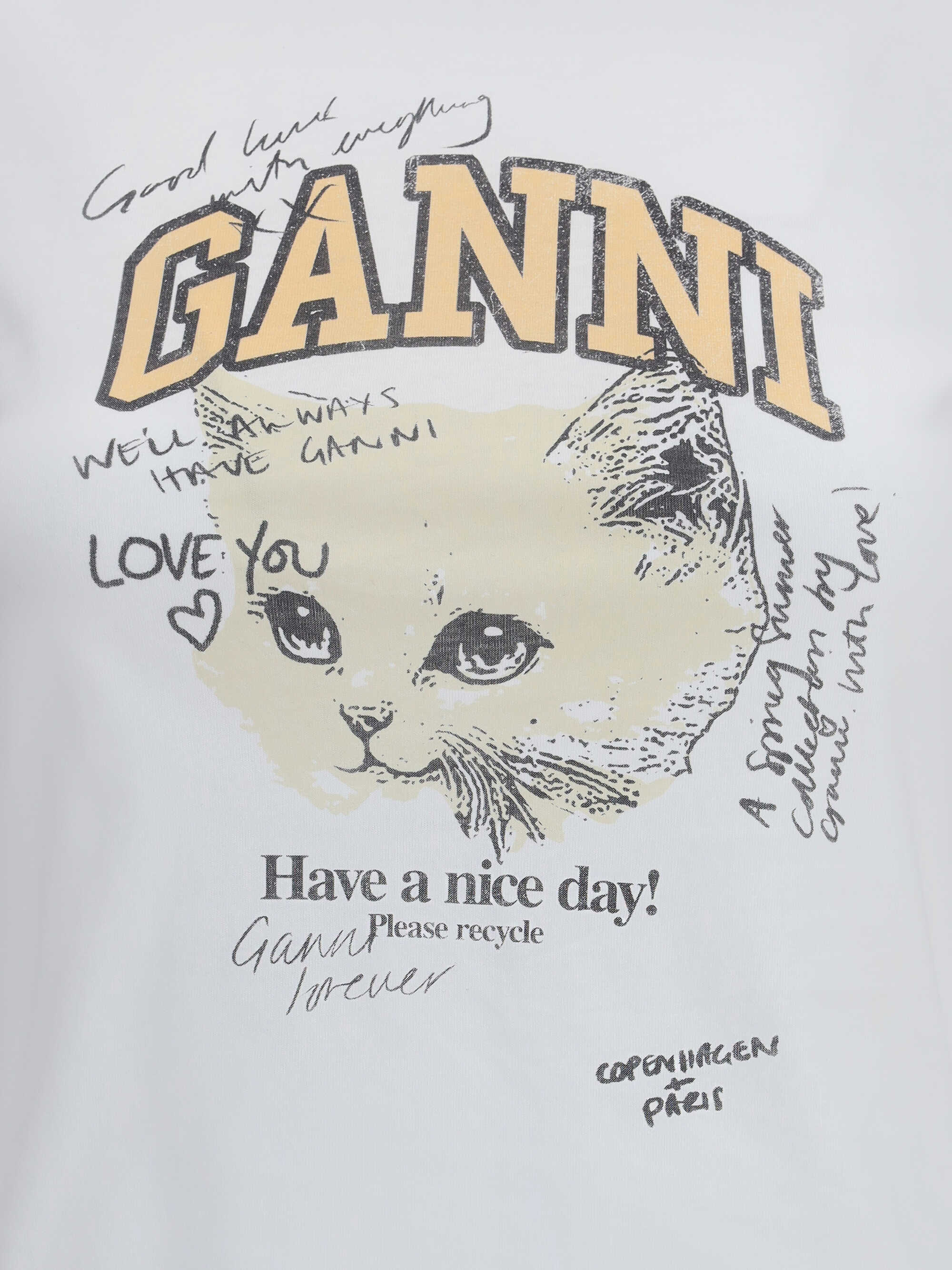 Ganni's Kitten print T-Shirt features a contrasting round neckline and short sleeves. The GANNI logo embellishes the garment, while the print of a cat accompanied by the words "Have a nice day! Please recycle!" adds a fun touch and an eco-friendly message.