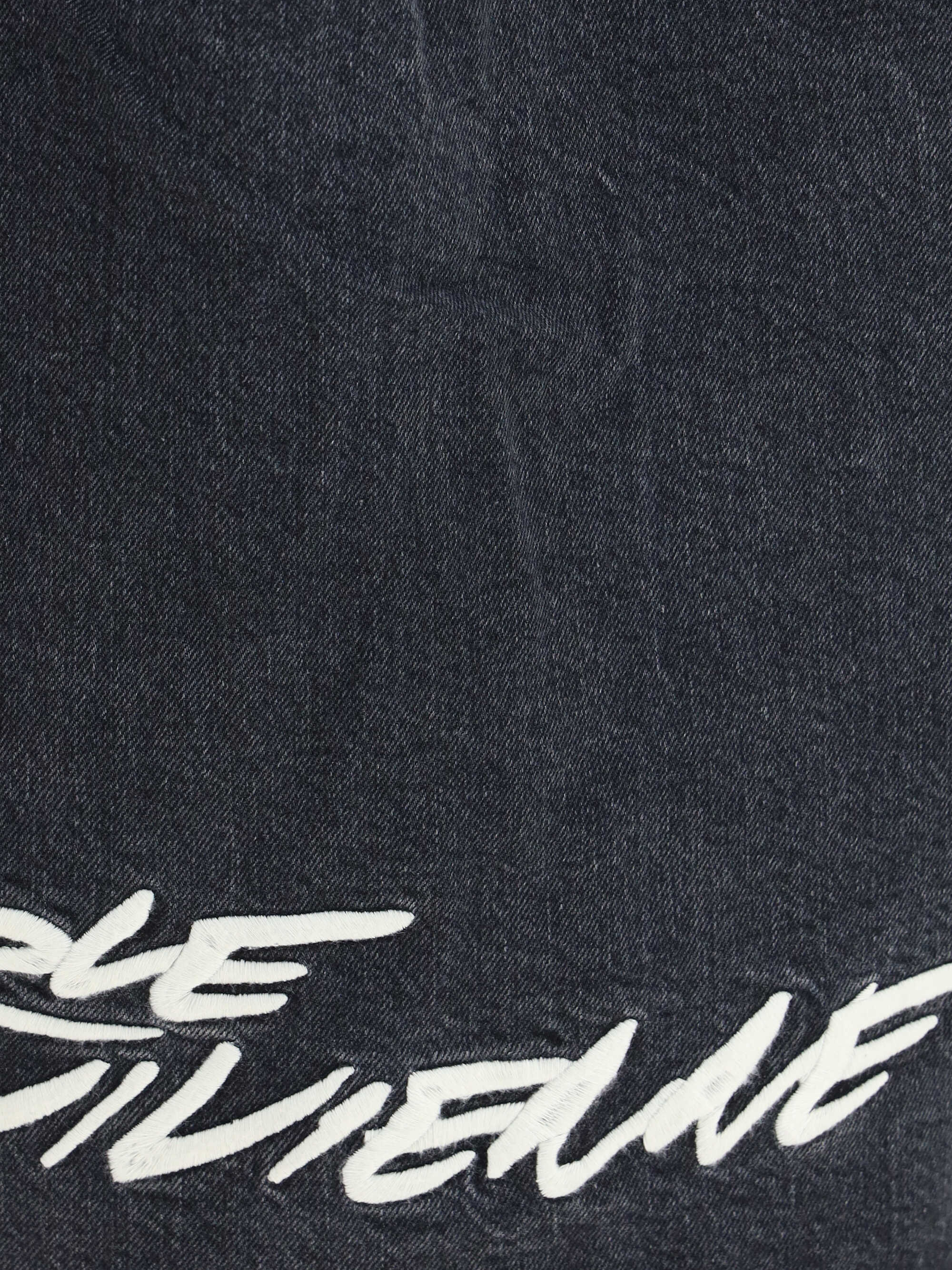The Kenzo x Futura 2000 Japanese stone bleach wash denim shirt features a classic collar, single-breasted closure, button cuffs, and Futura 2000 Boke Flower embroidery on the chest, complemented by a logo label on the back.