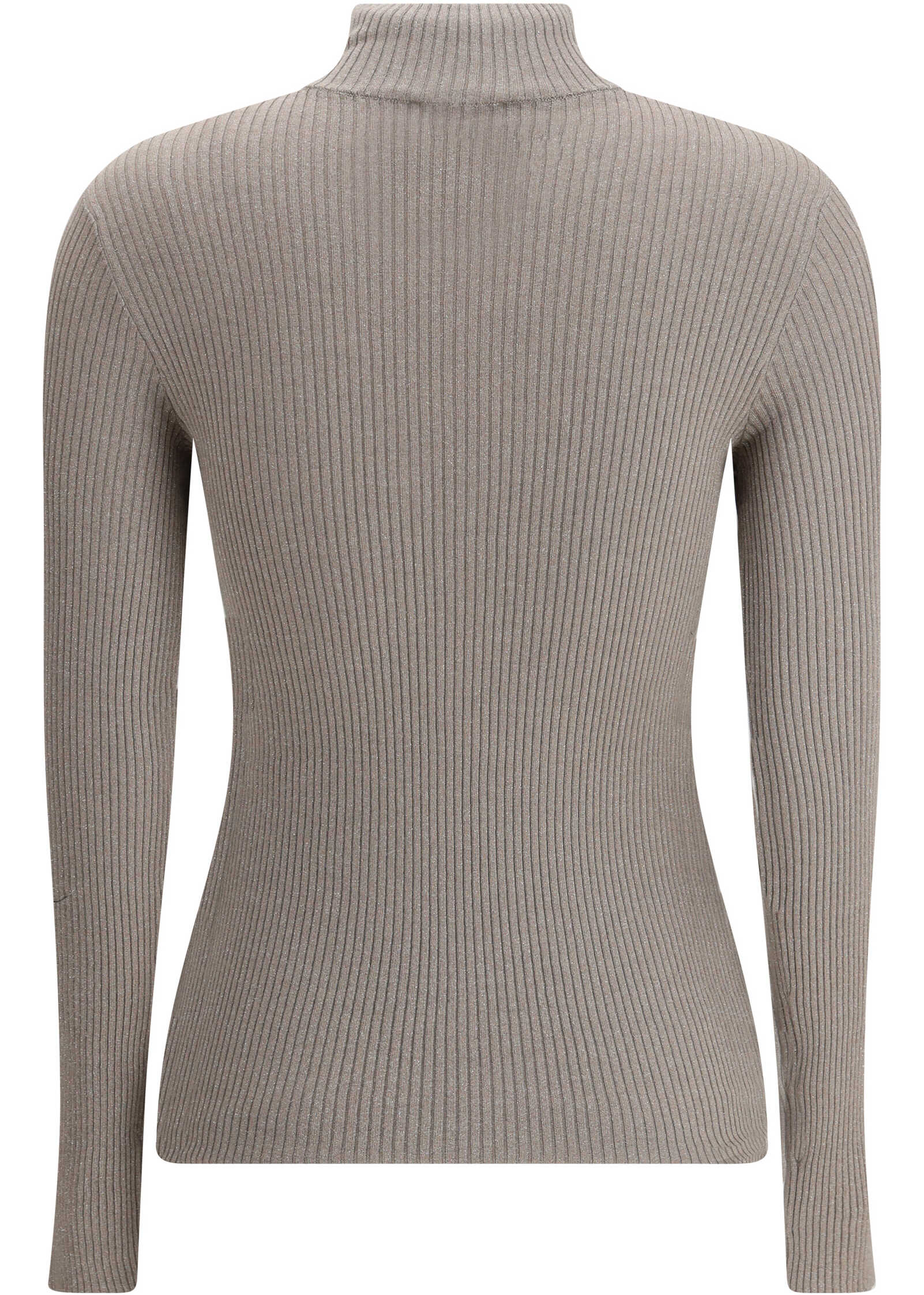 The High Neck Zip Top is an elegant and sophisticated piece, featuring a fabric that recalls lamé thanks to its shimmering highlights. The long sleeves and zipper give a functional and modern touch, while under the zipper is a refined shimmering monile detail in shades of silver and gray, which adds a discreet glow. Composed primarily of cashmere and silk, this top is the epitome of comfort and style, perfect for looks that want to combine elegance with a hint of sparkle.