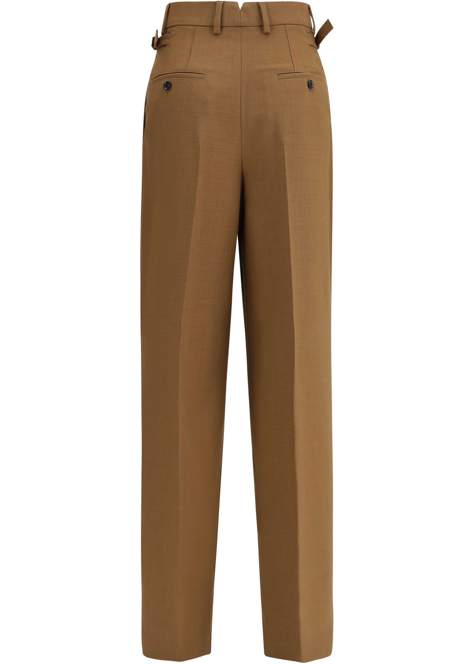 The High-waist Trousers by AMI are crafted from light wool twill and feature a wide fit. They have a high waist, zip and horn button closure, and buttoned back pockets. On the sides, two adjustable tabs with metal buckles engraved “AMI” allow for a customizable fit. The design is completed by the V-shaped back detail, front pleats, and front lining extending to the knees.