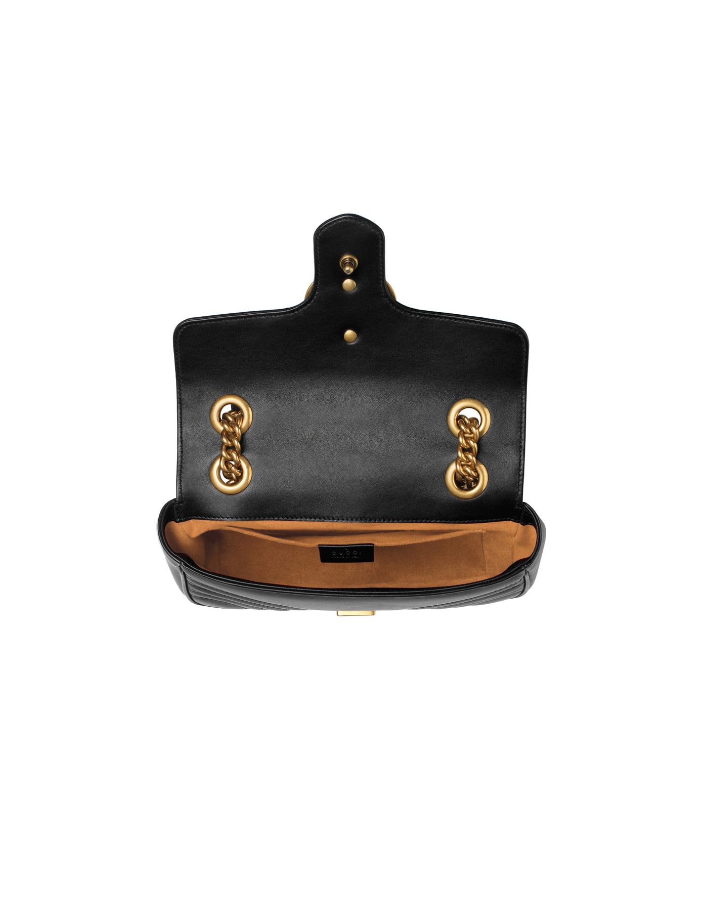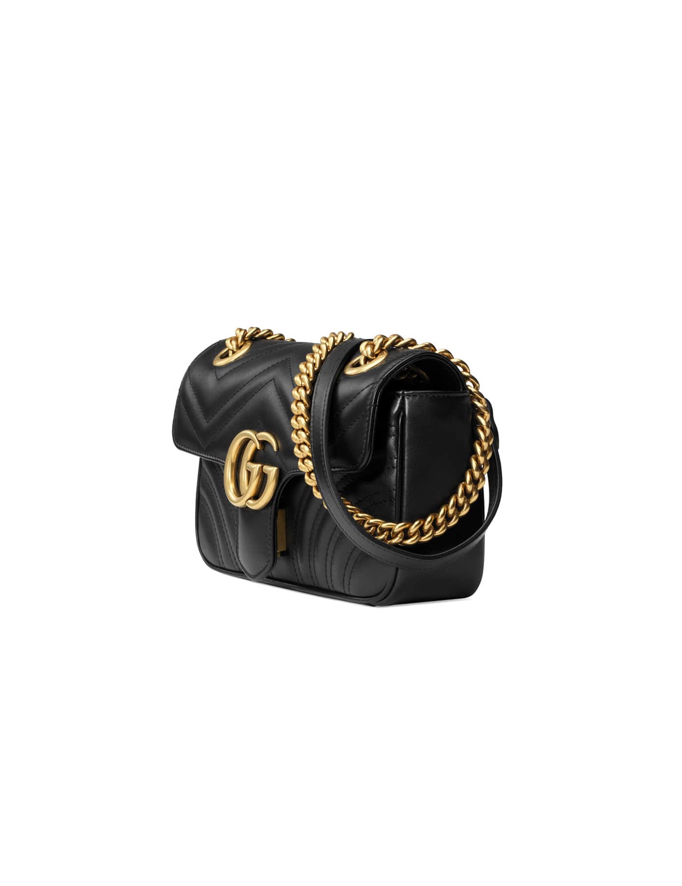 GG MARMONT 2.0 LEATHER SHOULDER BAG FROM GUCCI, FRONT FLAP CLOSURE WITH SNAP BUTTON, EMBOSSED ICONIC GG LOGO PLAQUE ON FRONT, PADDED AND QUILTED DESIGN, GOLD CHAIN SHOULDER STRAP WITH LEATHER DETAILING, EMBROIDERED HEART ON BACK, SINGLE INTERIOR COMPARTMENT.