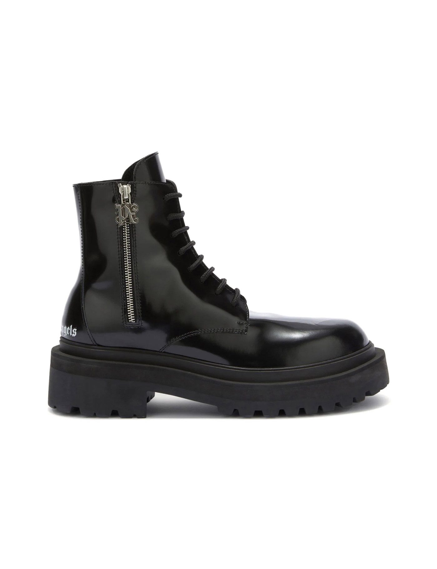 Crafted from leather in a bold high-shine finish, these Palm Angels lace-up ankle boots sit atop a chunky low heel. They're embellished with a contrasting logo print at the heel for a branded touch.