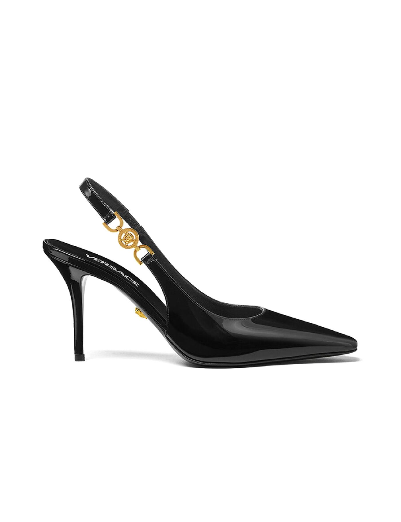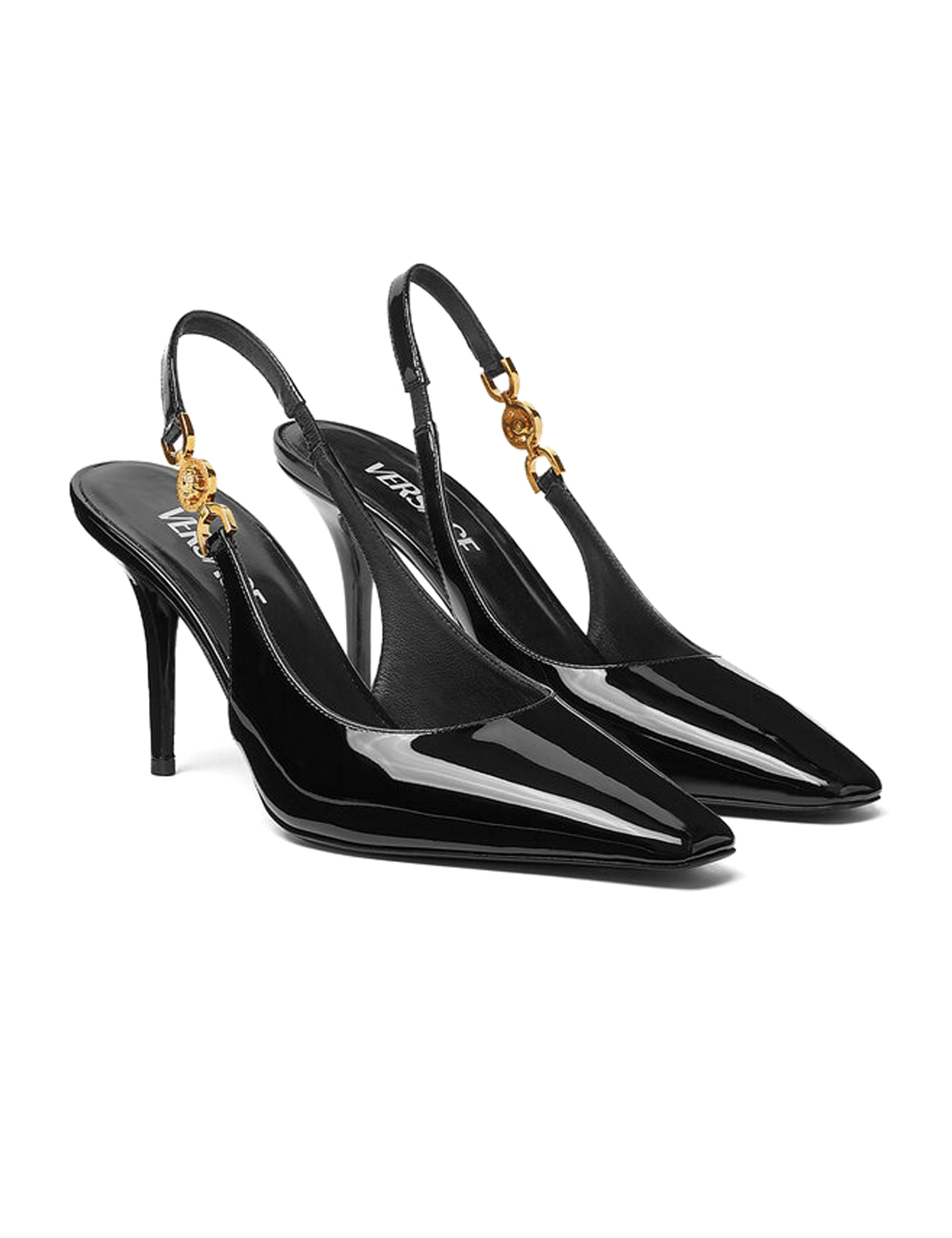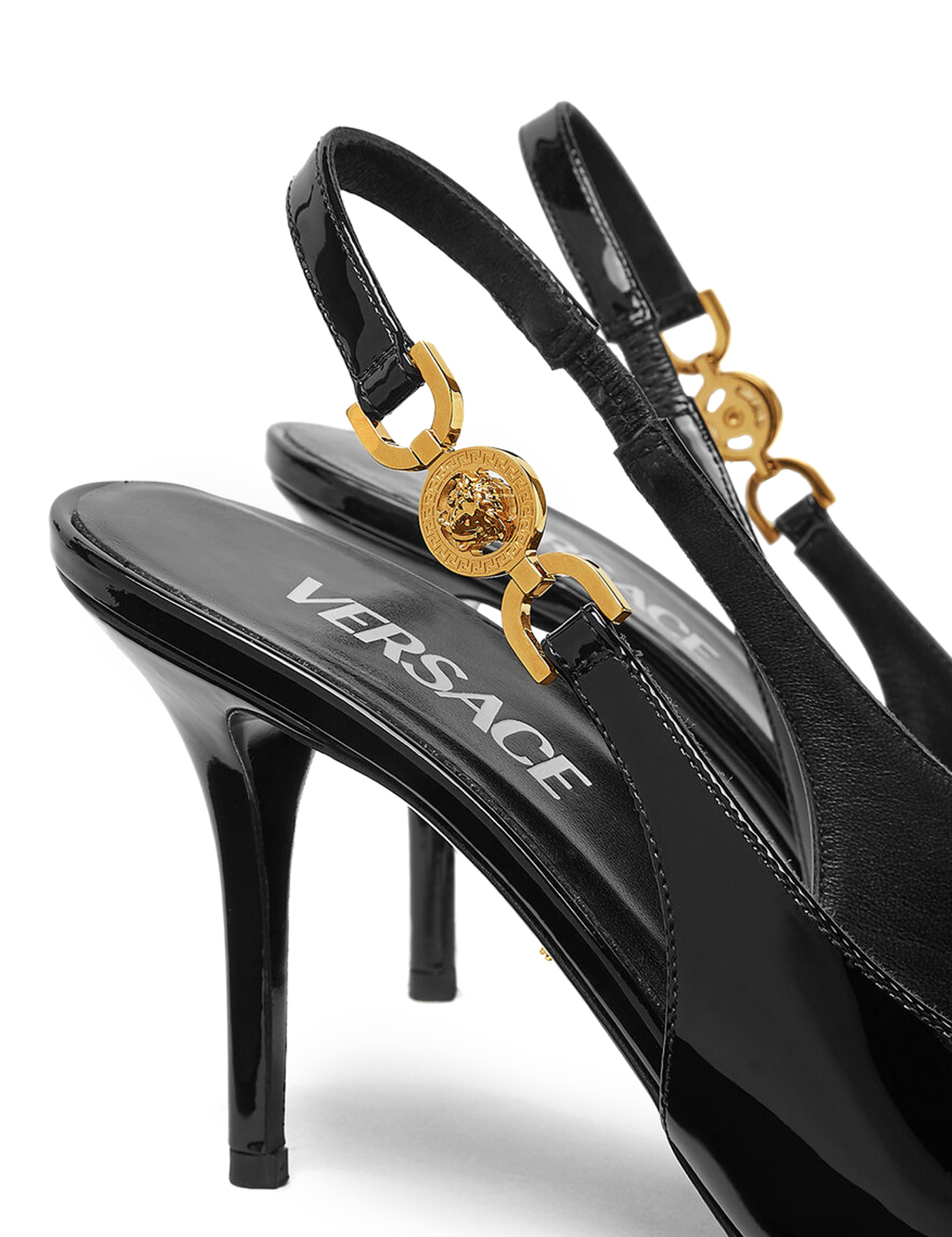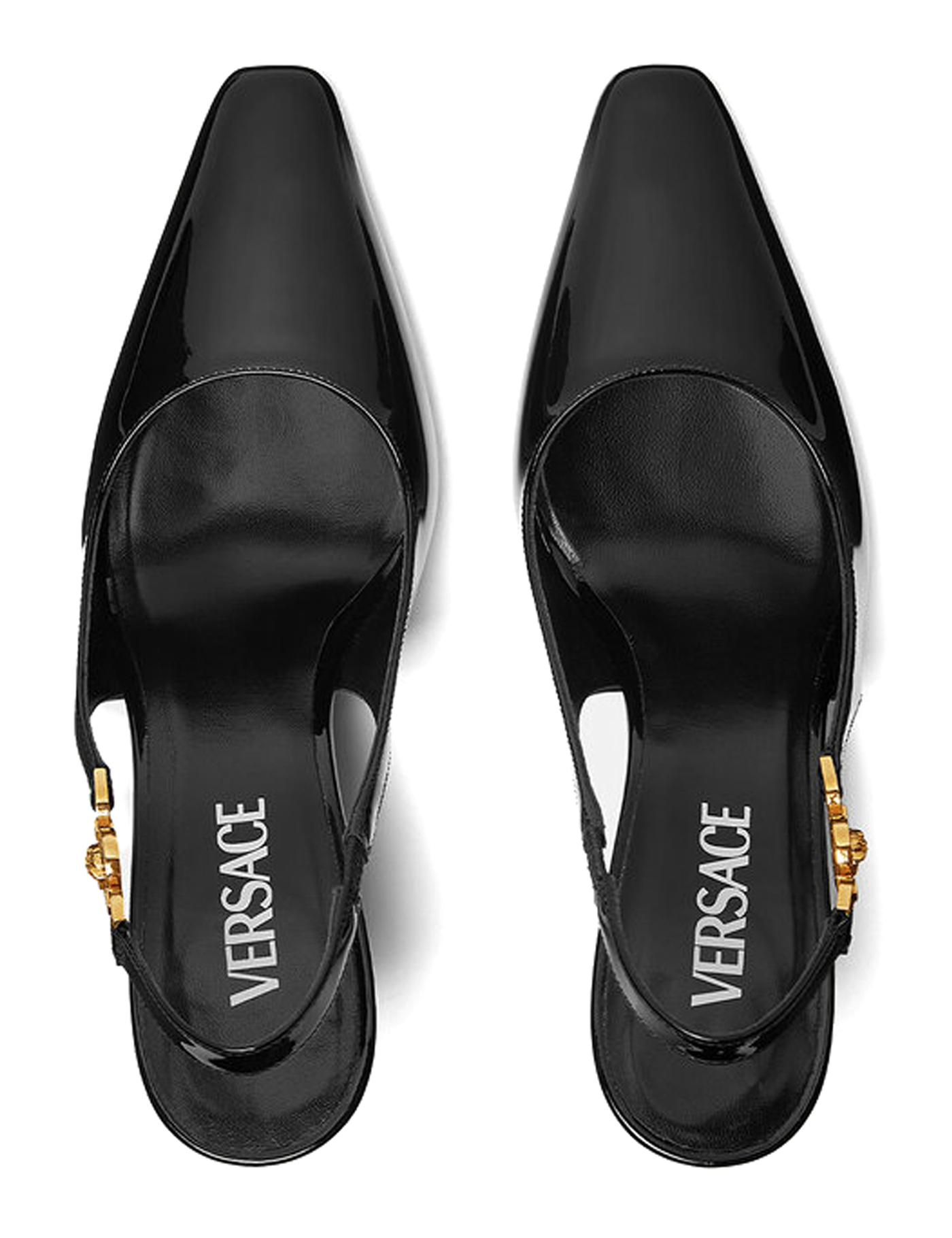 These mid-heel pumps are made from patent leather with a squared toe and a Medusa '95 emblem at the slingback strap.