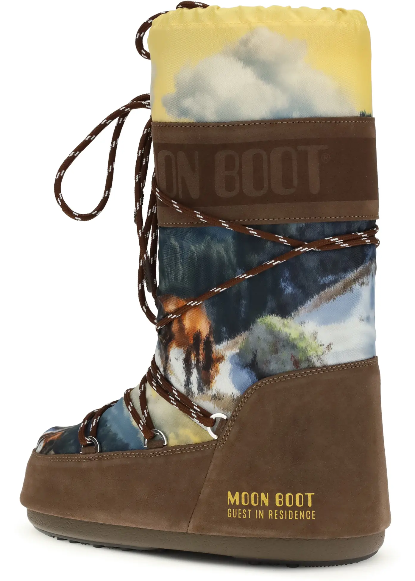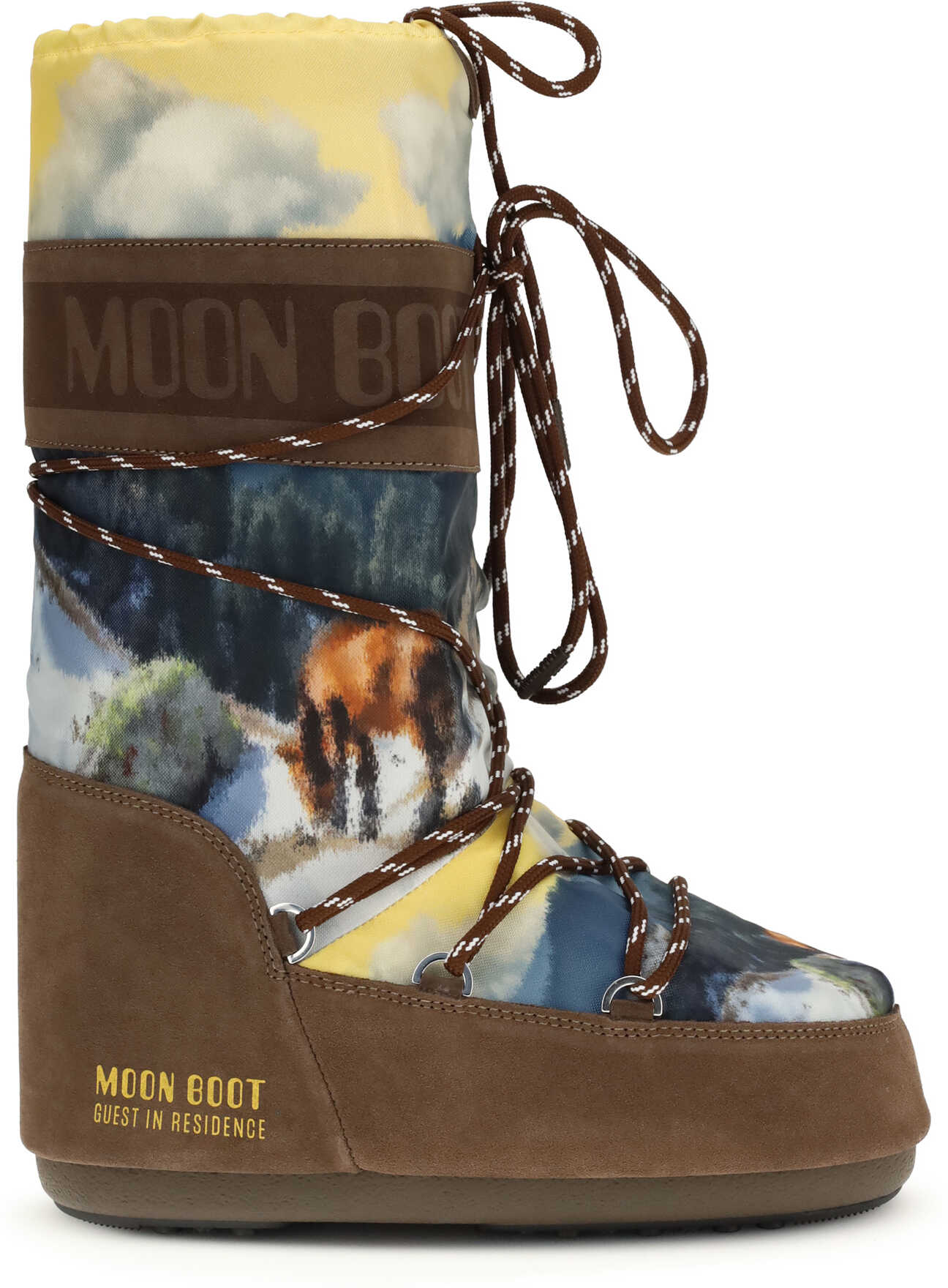 The Moon Boot X Guest In Residence print Boots combine fashion and functionality with a bold and original design. The unique and charming landscape print gives these boots a distinctive touch. The suede paneled design adds texture and style, while the lace-up closure ensures a secure fit. The rubber outsole ensures grip and comfort, while the knee-high design offers protection from the elements. Perfect for those looking for a pair of boots that are as functional as they are unique, with an artistic and refined twist.