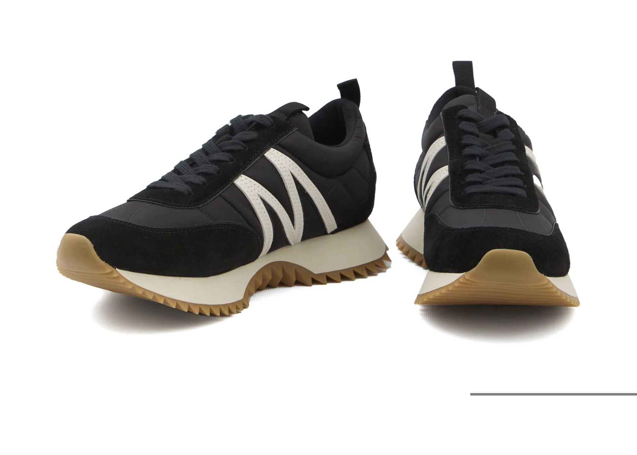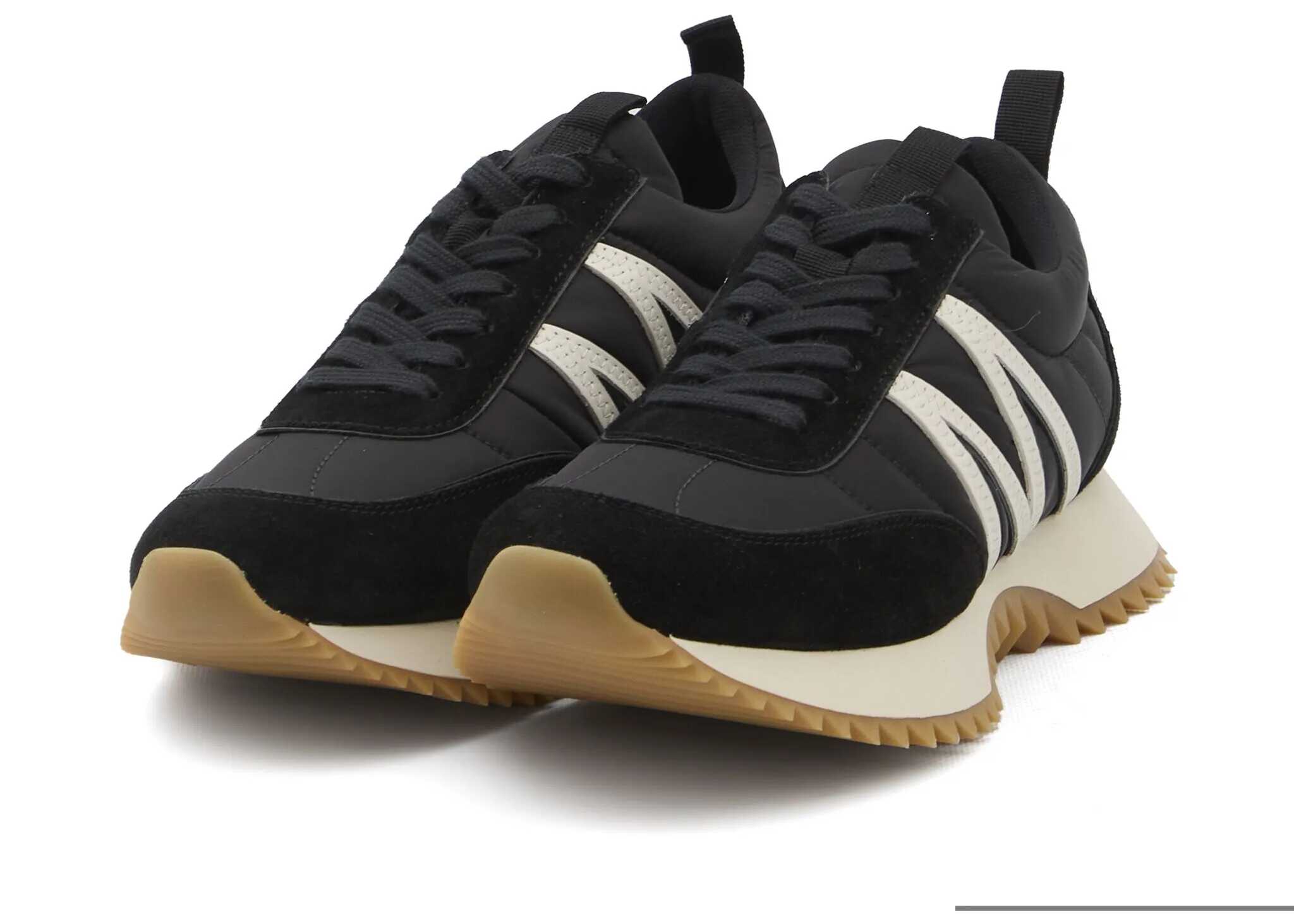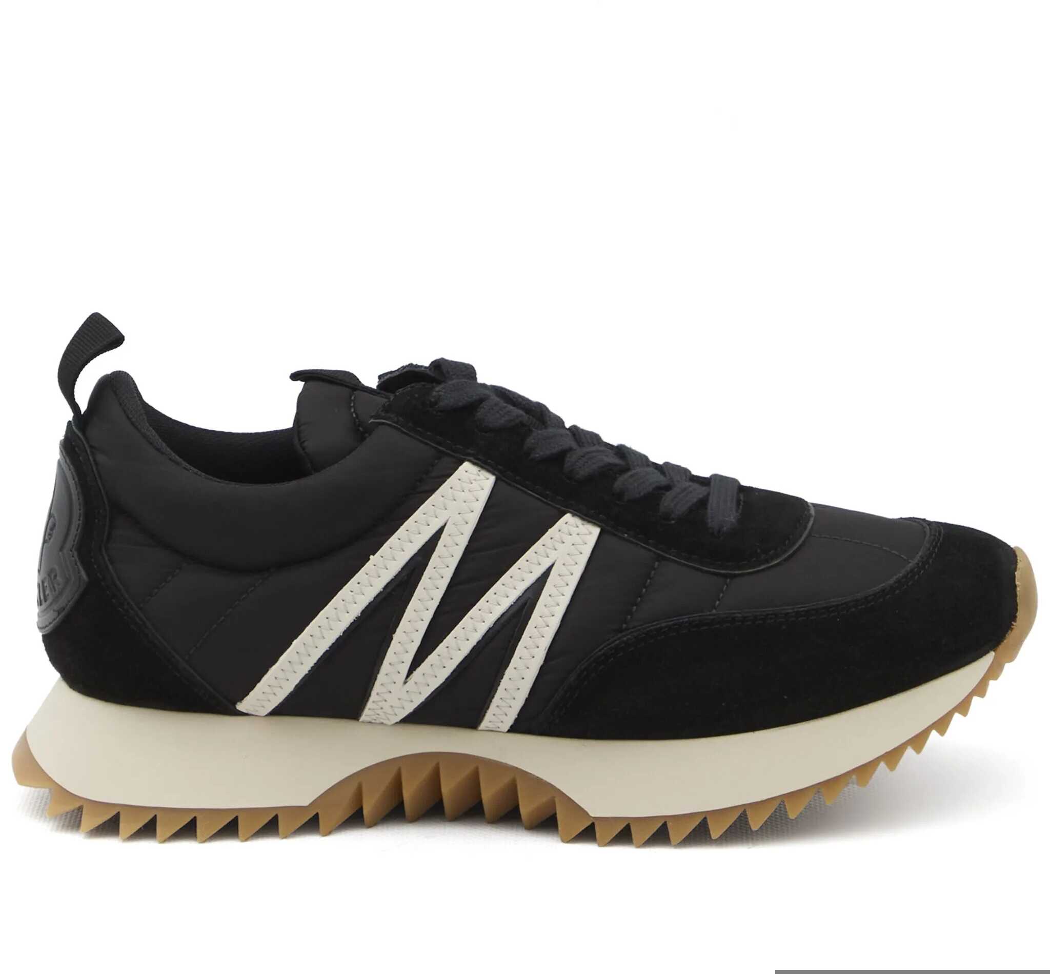 Pacey sneakers in black nylon and suede. They feature a lace-up closure, white M-shaped detail on the sides, external padding, a black leather logo patch on the heel, fluorescent yellow interior, and TR outsole. Dust bag included. Any imperfections in the leather should not be considered manufacturing defects but rather a characteristic of the material.