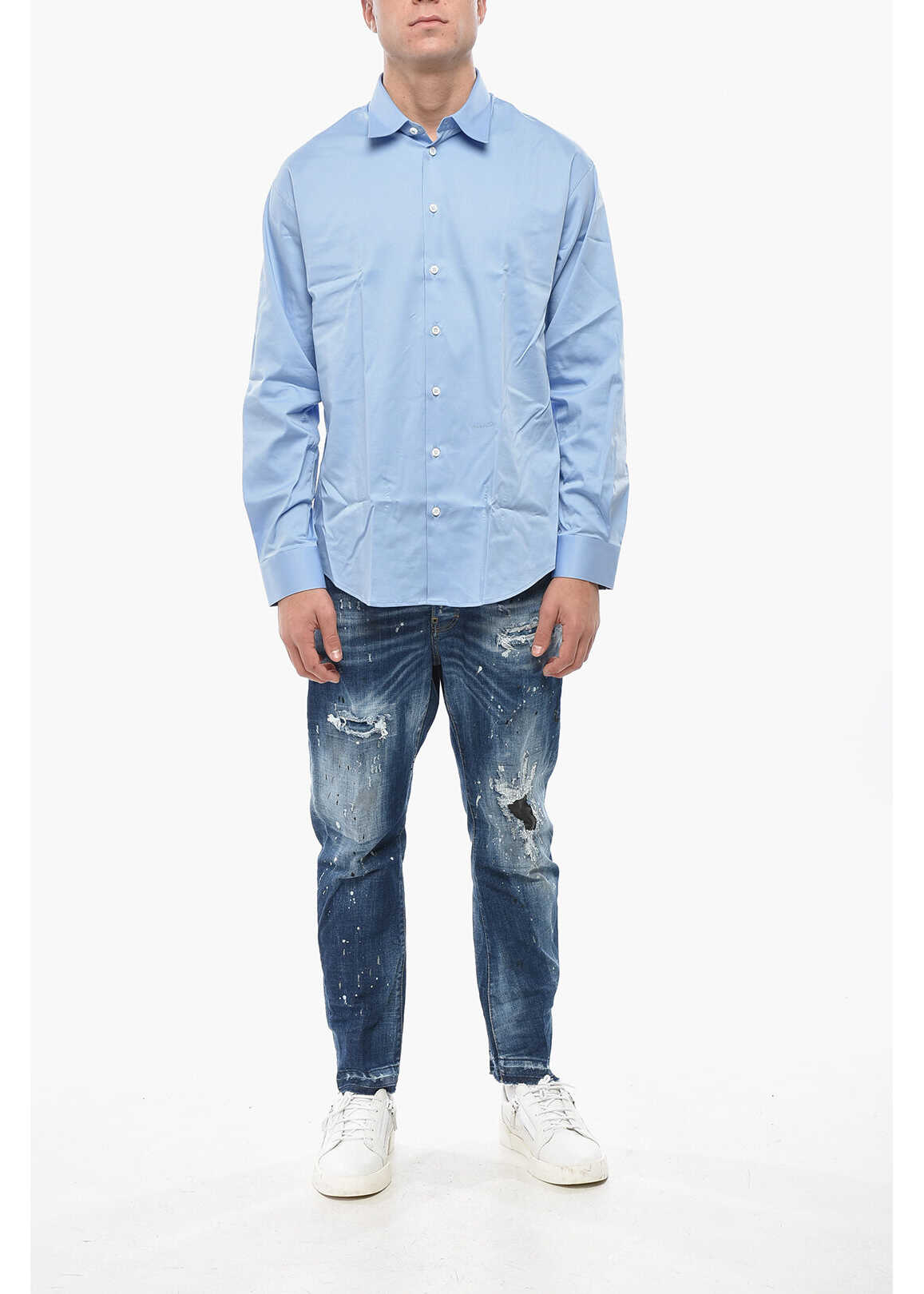 French collar Sleeves with buttons Logo Long sleeves Buttons Embroidery Front closure Light blue Made in Italy Spring-Summer Materials: 96%CO 4%EA Product code: P710661 Model is wearing size 50 Model measurements Height: 186 cm Chest: 109 cm Waist: 82 cm Hips: 98 cm