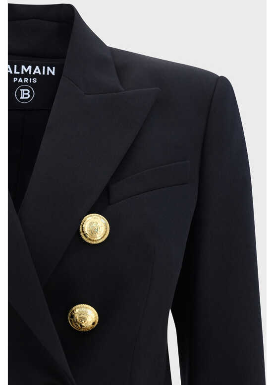 Wool Blazer Jacket by Balmain, double-breasted front closure with embossed buttons, classic lapel, two welt pockets with side flap, a front slit pocket, back slit, structured shoulders, regular fit.
