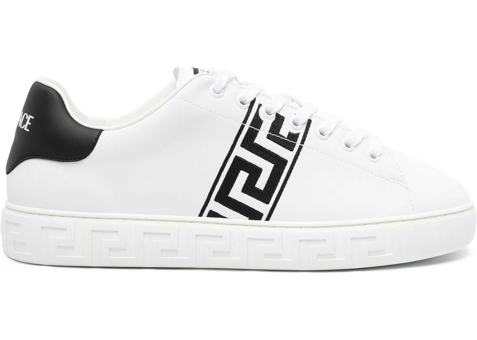 The leather Sneakers by Versace feature a round toe and a flat sole embellished with the brand's iconic embossed Greek. The front lace-up closure ensures comfort, while the contrasting monogram detail on the back and the contrasting Greek on the side panels add a distinctive and recognizable touch.