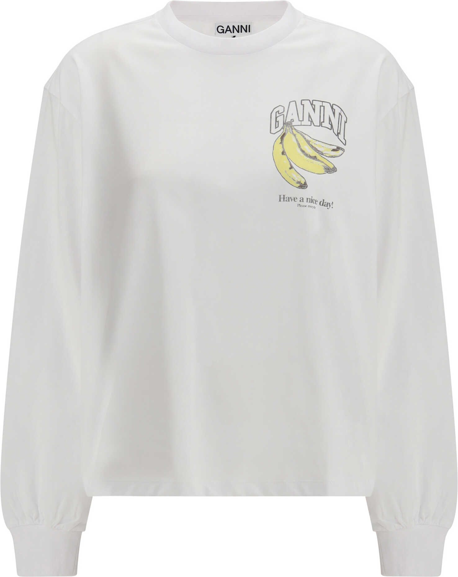 The Long-Sleeve T-shirt By Ganni brings subtle charm to a clean, everyday silhouette. The round neckline creates a balanced, minimal frame, while ribbed cuffs add soft structure. On the upper left side, the small cherry graphic introduces a playful, signature touch that reflects Ganni’s joyful aesthetic. A piece that turns simplicity into quiet personality.