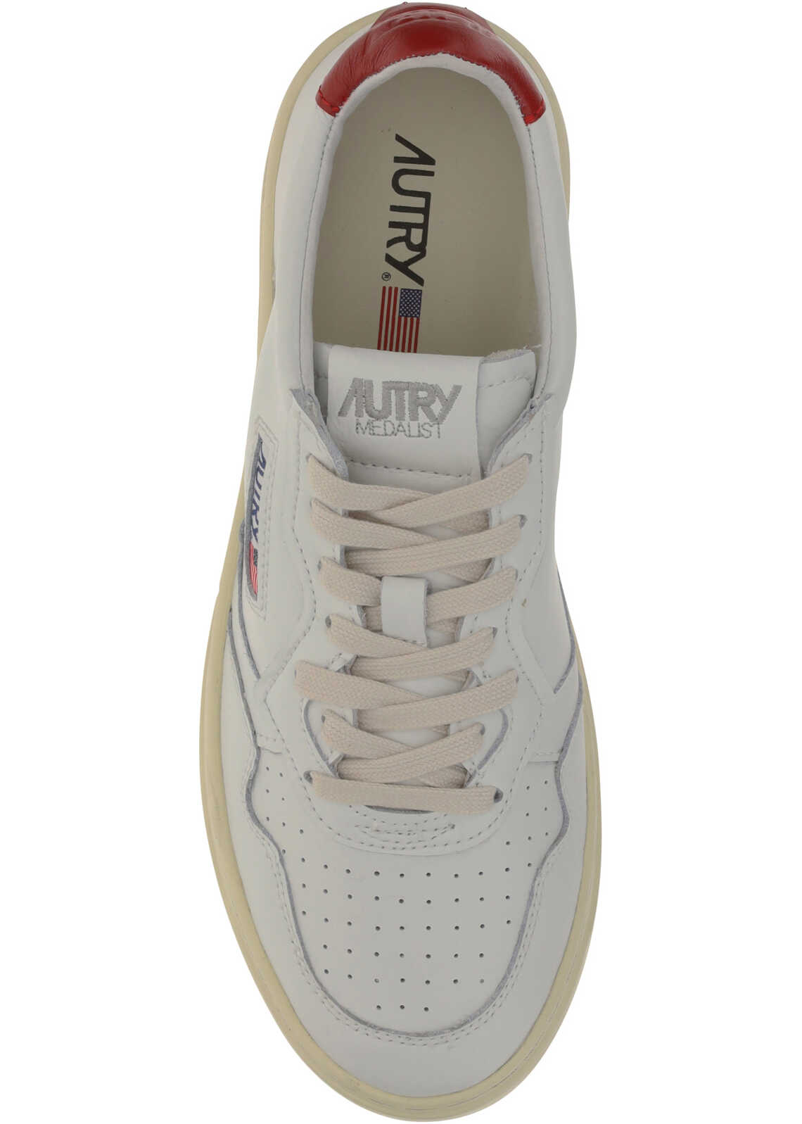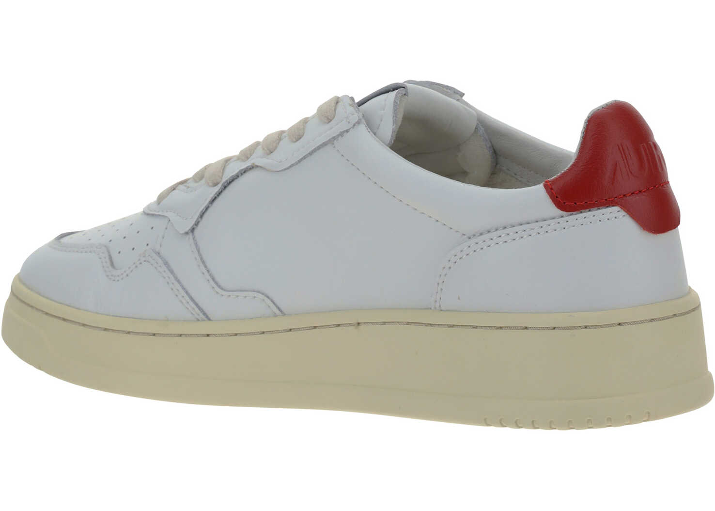 Calfskin Low 01 Sneakers by Autry, perforated round toe, perforated front lace-up closure, leather tongue with tonal stitched logo label, iconic tonal heel at back with imprinted logo, logo-embossed insole, flat sole.