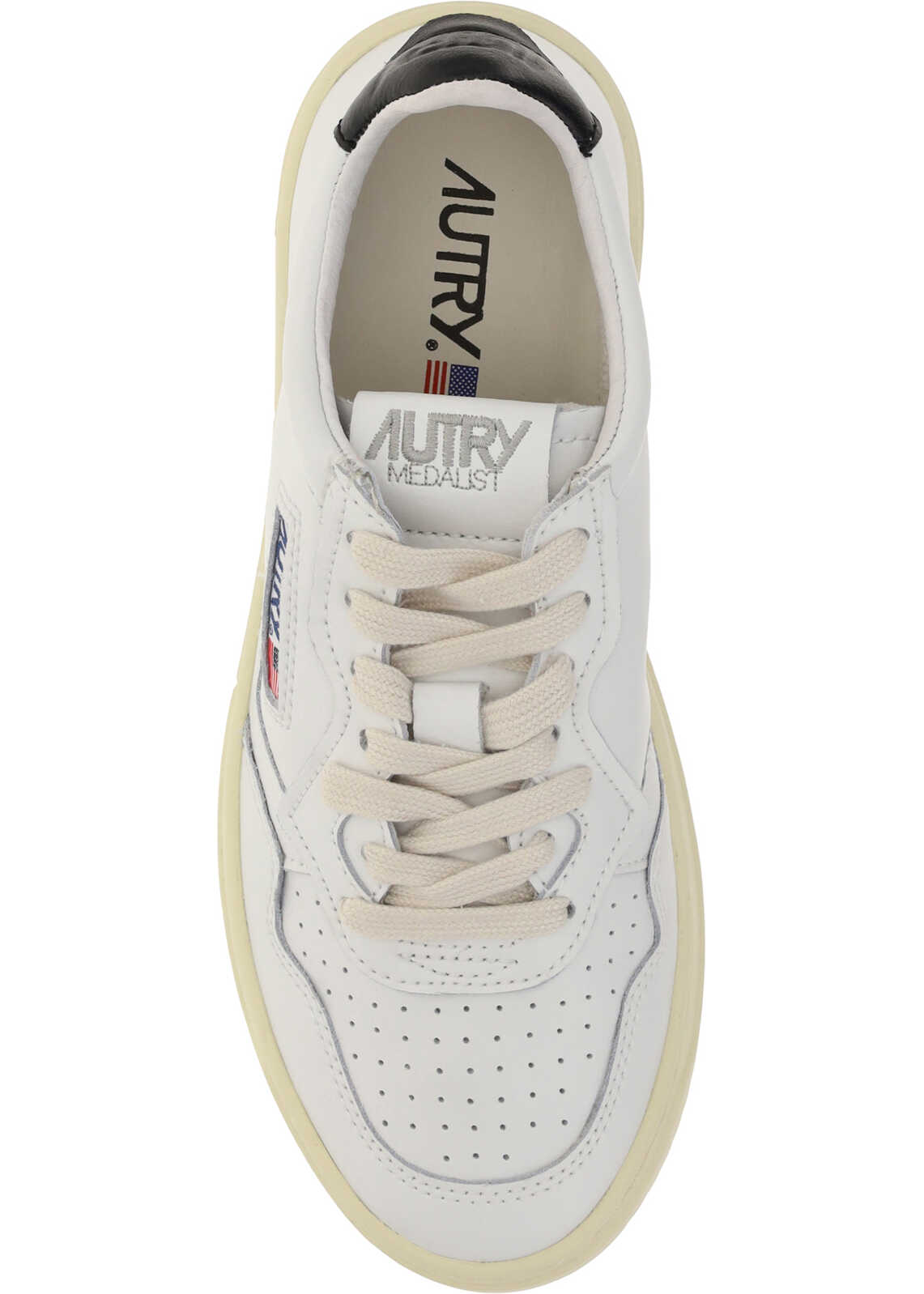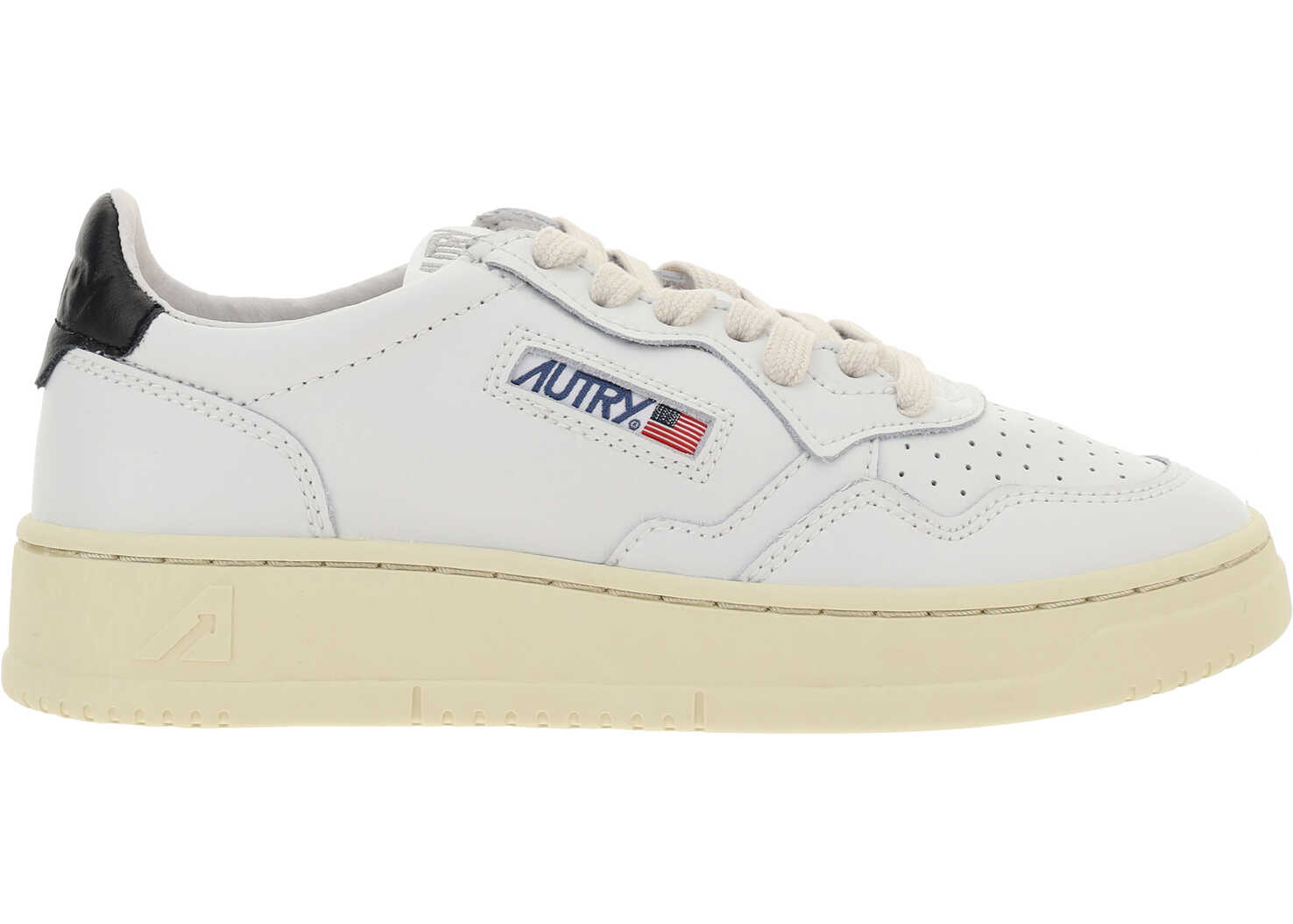 Calfskin Leather Sneakers by Autry, round and perforated toe, frontal lace up closure, tonal label seamed on a leather tongue, iconic back patch in contrast with embossed logo, branded sole in rubber, iconic lateral U.S. flag detail with logo.