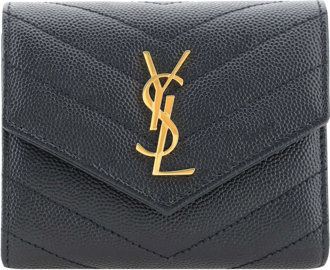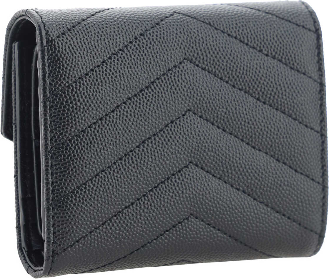 Leather YSL Cassandre Wallet by Saint Laurent, folding trifold model, quilted leather work, iconic three-dimensional plaque on front, interior magnetic button closure, interior card slot, coin compartment.