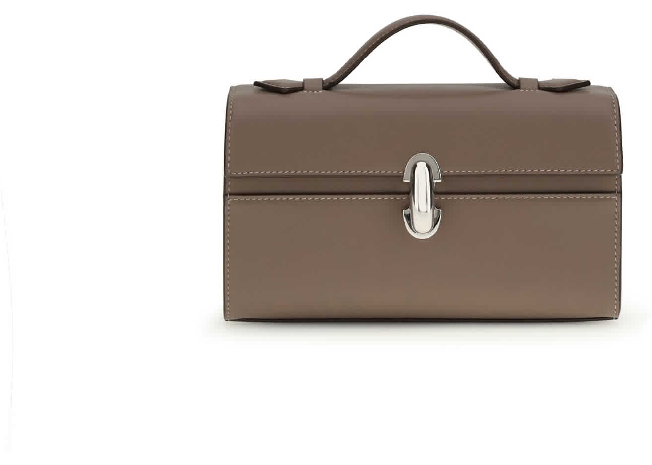 The Symmetry Pochette by Savette is distinguished by its geometric design of parallel and perpendicular lines that define its minimal elegance. It features the iconic Symmetry snap closure, a functional interior pocket and a leather handle that complements its essential sophistication.