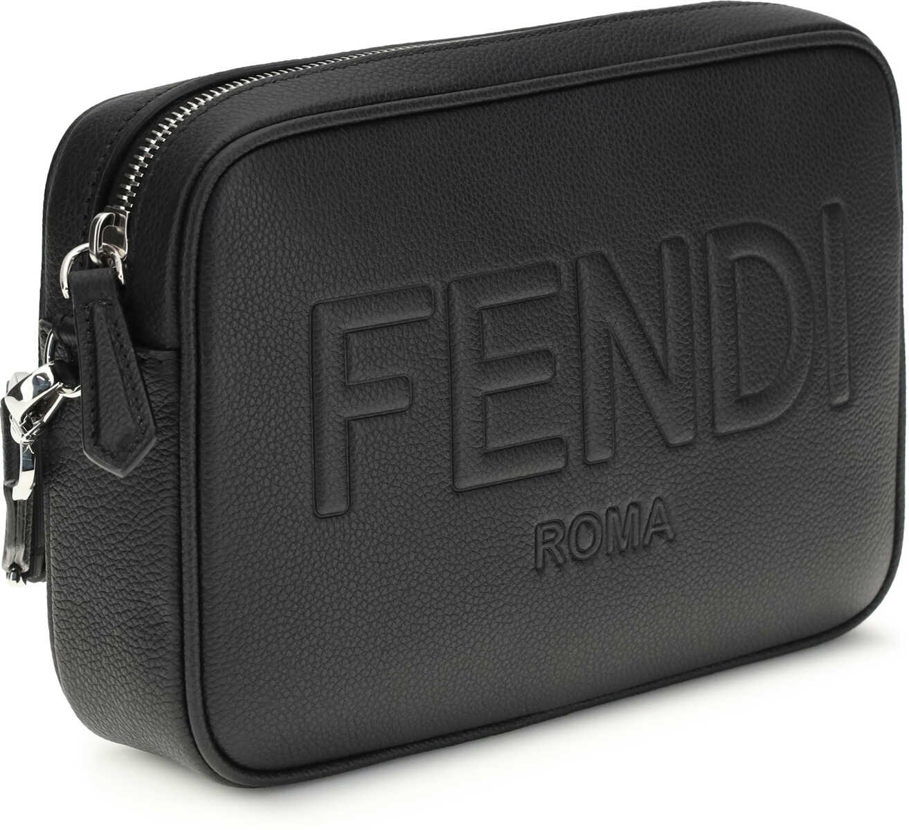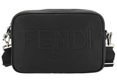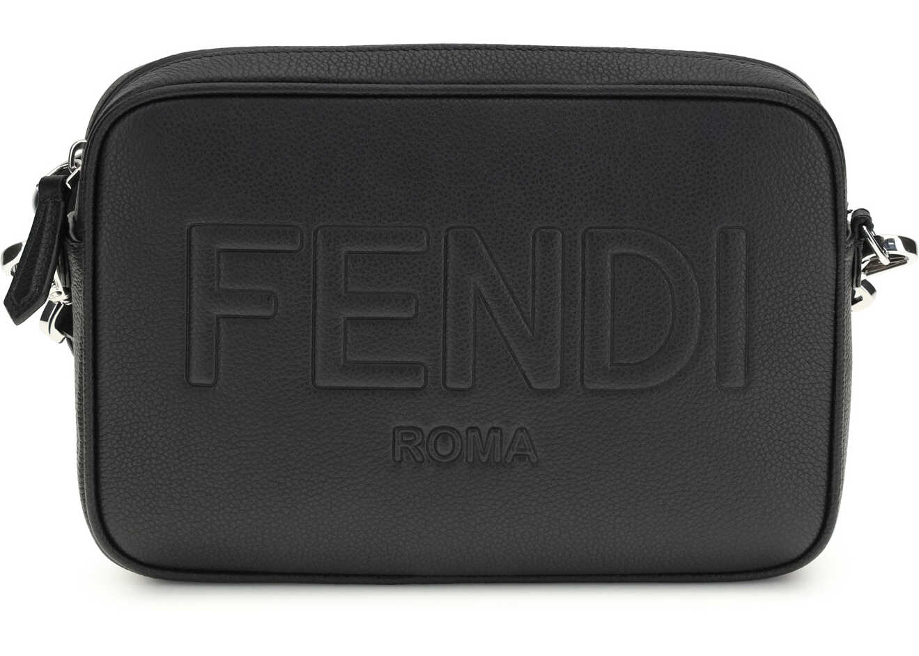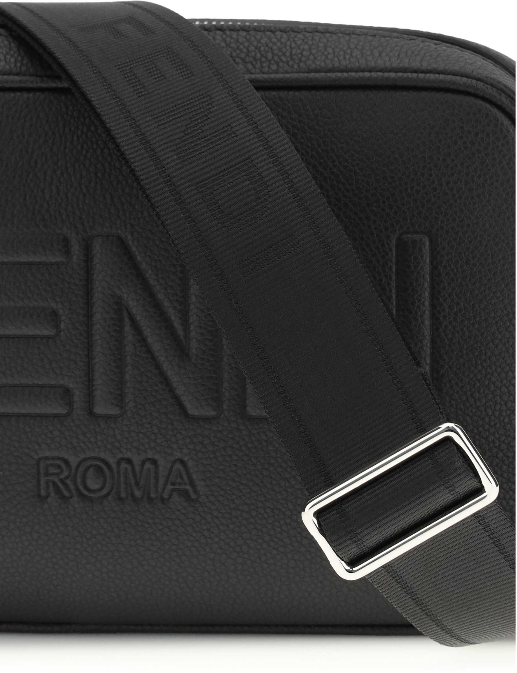 Camera Shoulder Bag by Fendi, top zipper closure, removable and adjustable flat nylon shoulder strap, iconic embossed Fendi Roma logo on front, garnet design, slit pocket on back, single interior compartment.