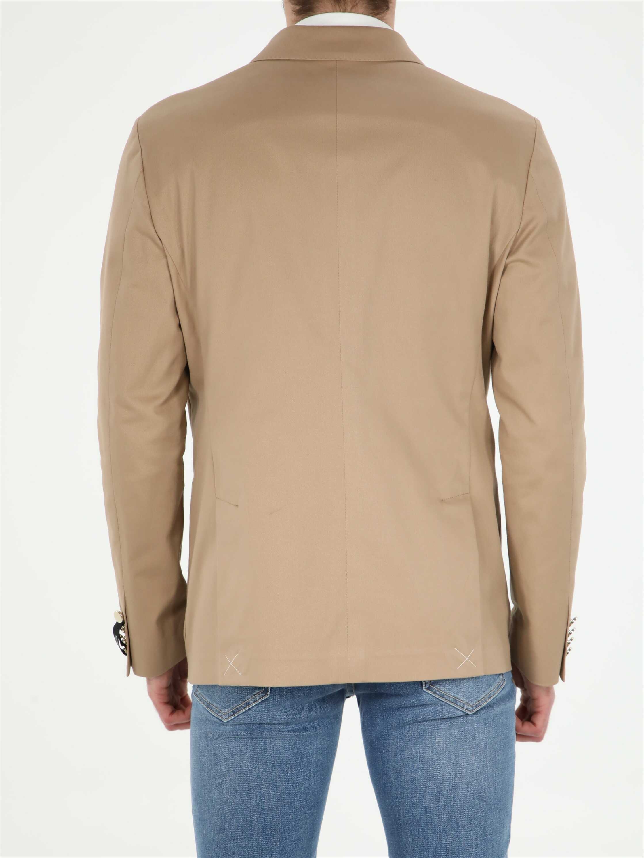 Beige stretch cotton jacket. It features double-breasted closure with front buttons, two maxi patch pockets on the front, one welt pocket on chest and buttoned cuffs.