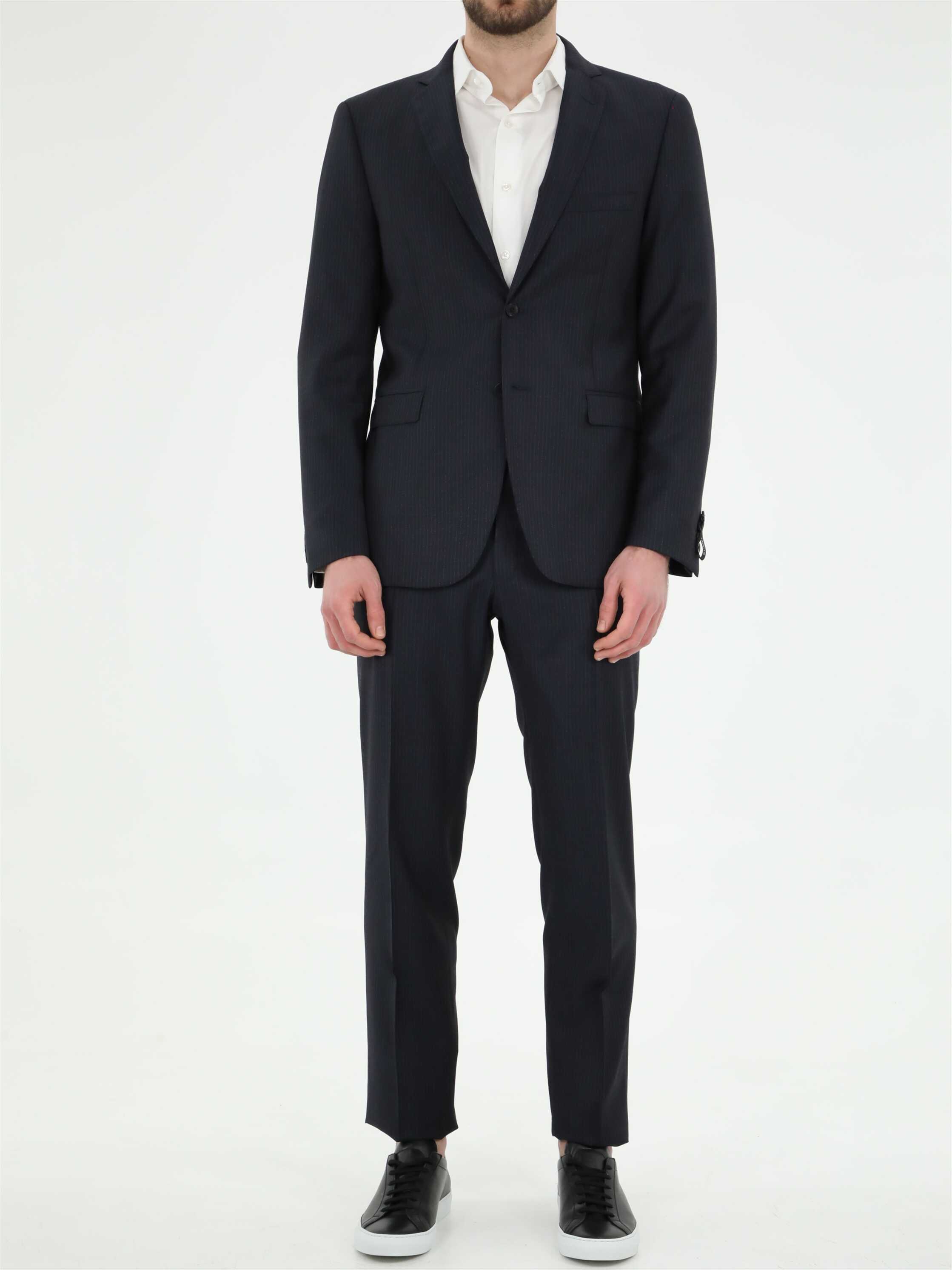Two-pieces blue wool pinstripe suit. Jacket with single-breasted closure with front buttons, peaked lapel, two front flap pockets, one welt pocket on chest and buttoned cuffs. Trousers feature straight leg, two side welt pockets and one rear welt pocket with button.