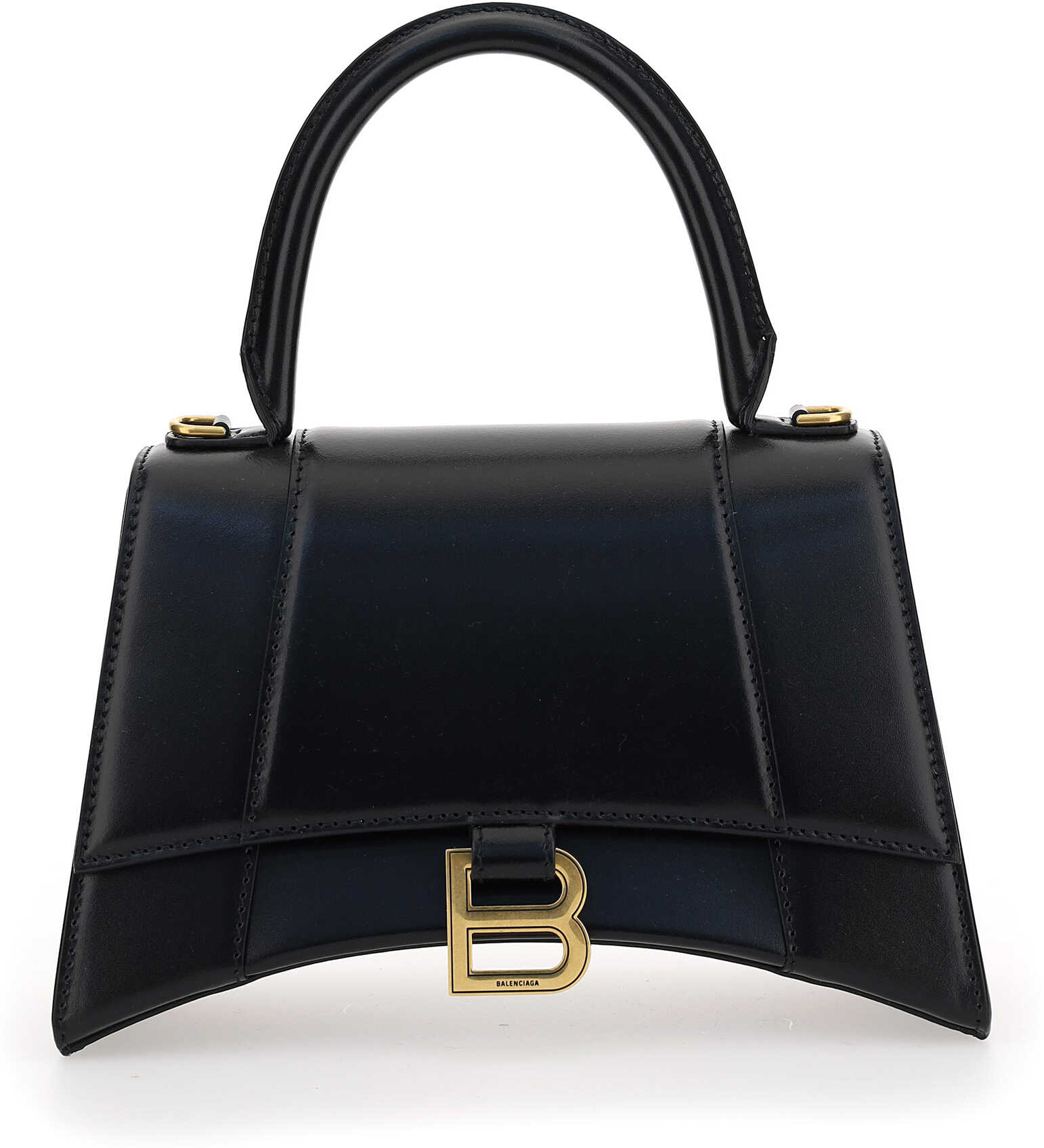 Calfskin Hourglass Handbag by Balenciaga, rigid top handle at top, magnetic flap closure at front, adjustable and removable shoulder strap, gold-plated iconic brand monogram plaque embossed on front, removable and adjustable flat shoulder strap, patent leather design.