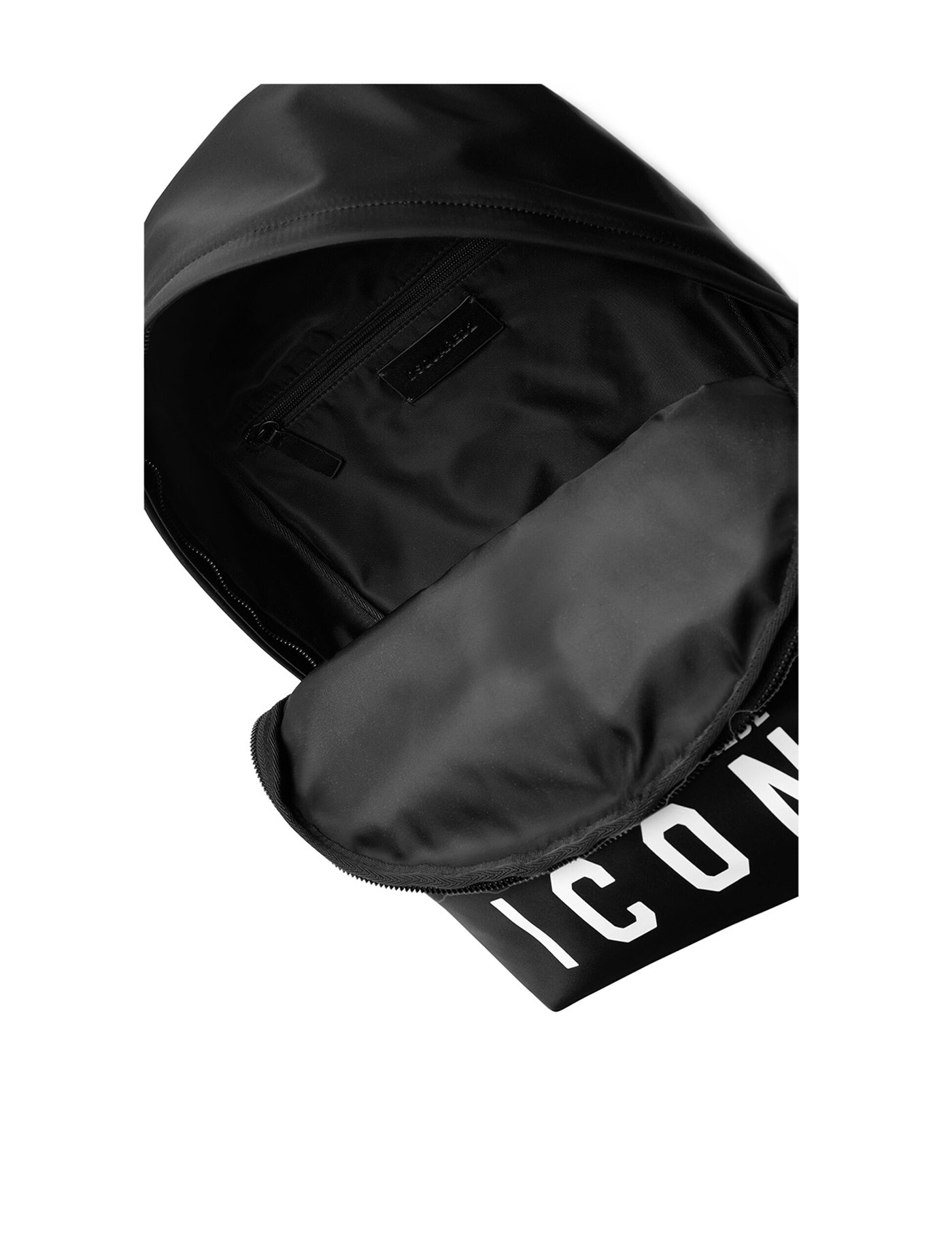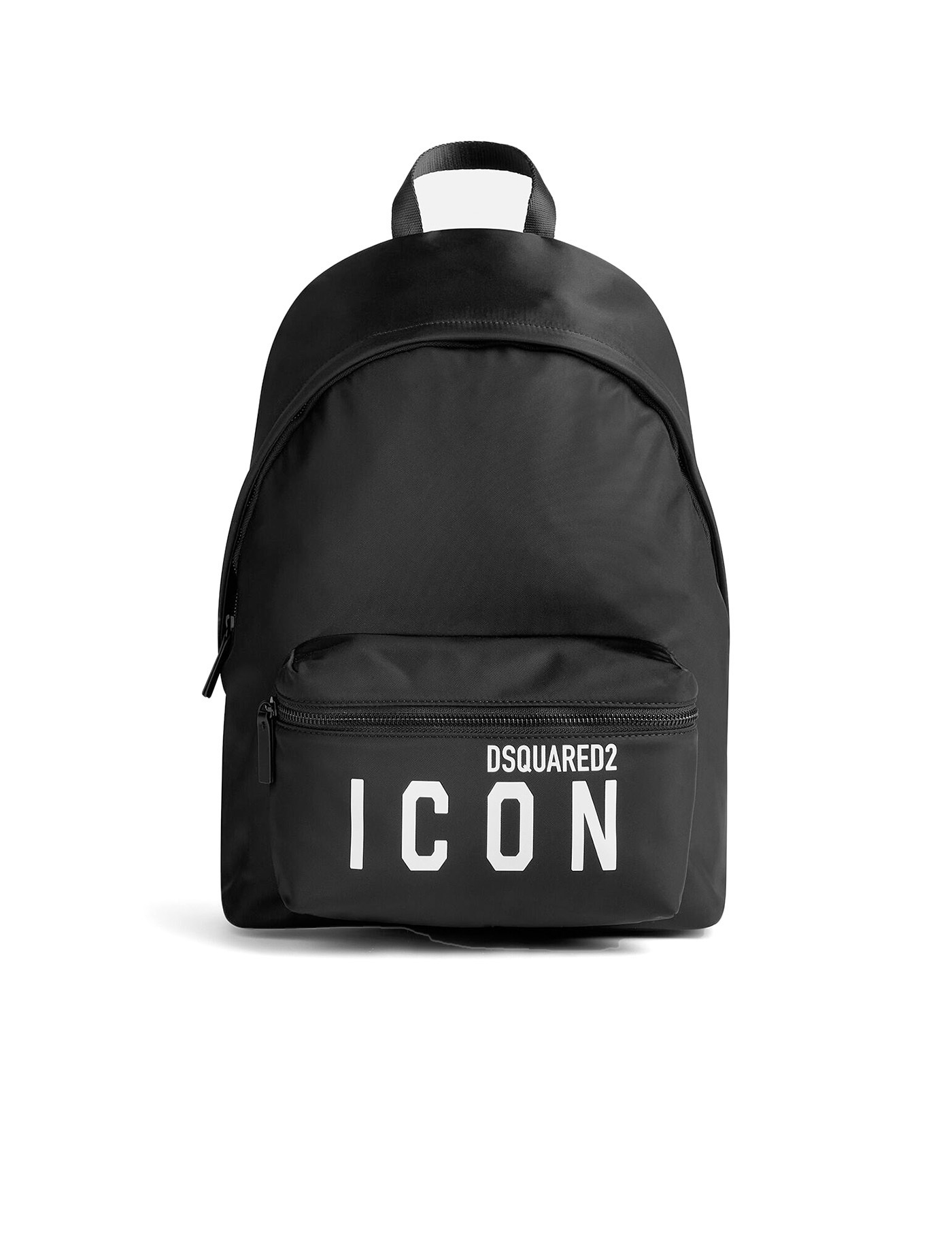 Be Icon backpack by Dsquared2 made of black nylon, featuring a large compartment with zip and slip pockets. Leather finishes, external pocket with contrasting printed logo. Padded, adjustable shoulder straps. Measures 45x34x26 cm.