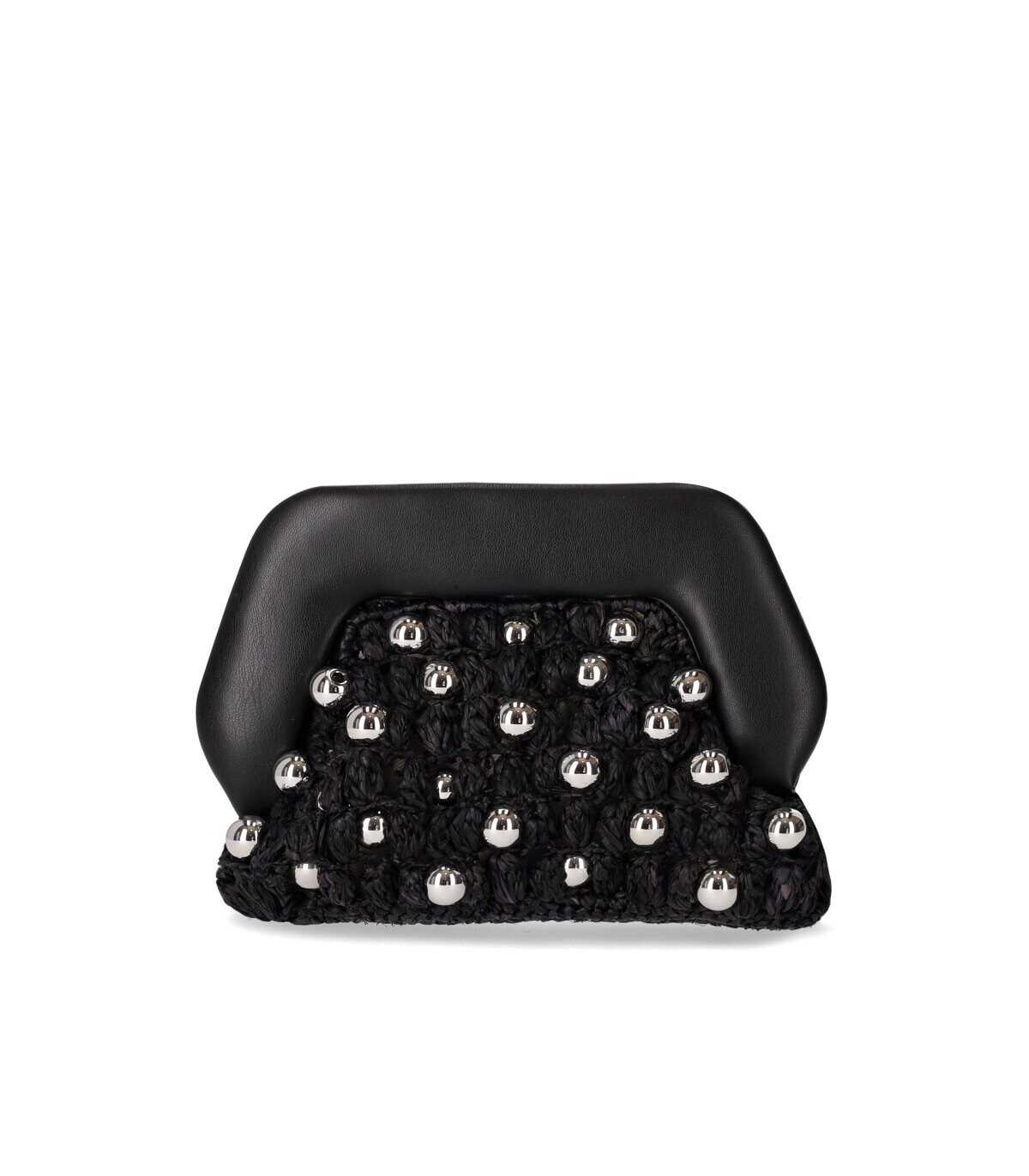 Gea Straw Beads clutch by Themoirè made of vegan leather and raffia in shades of black, decorated with maxi pearls in silver metal. Lined interior with recycled materials and magnetic closure. Adjustable and removable shoulder strap, measures 22x15x10 cm.