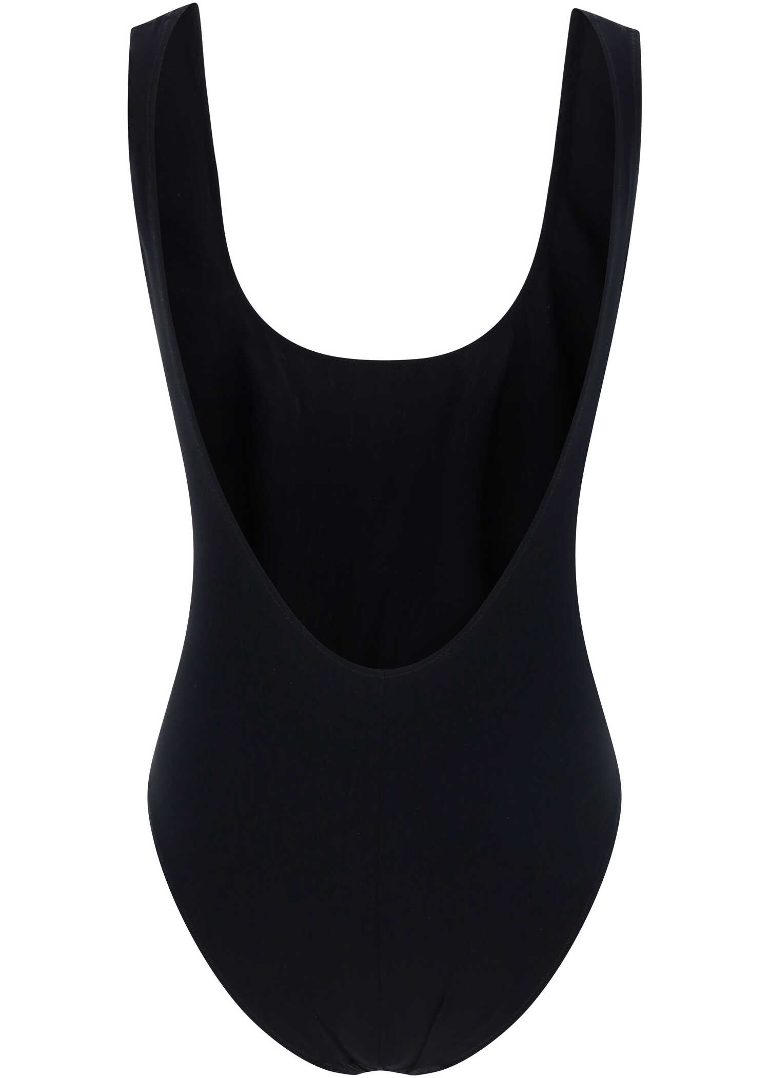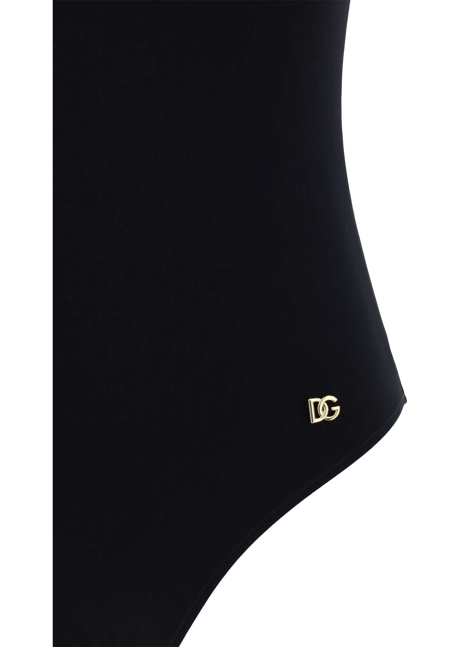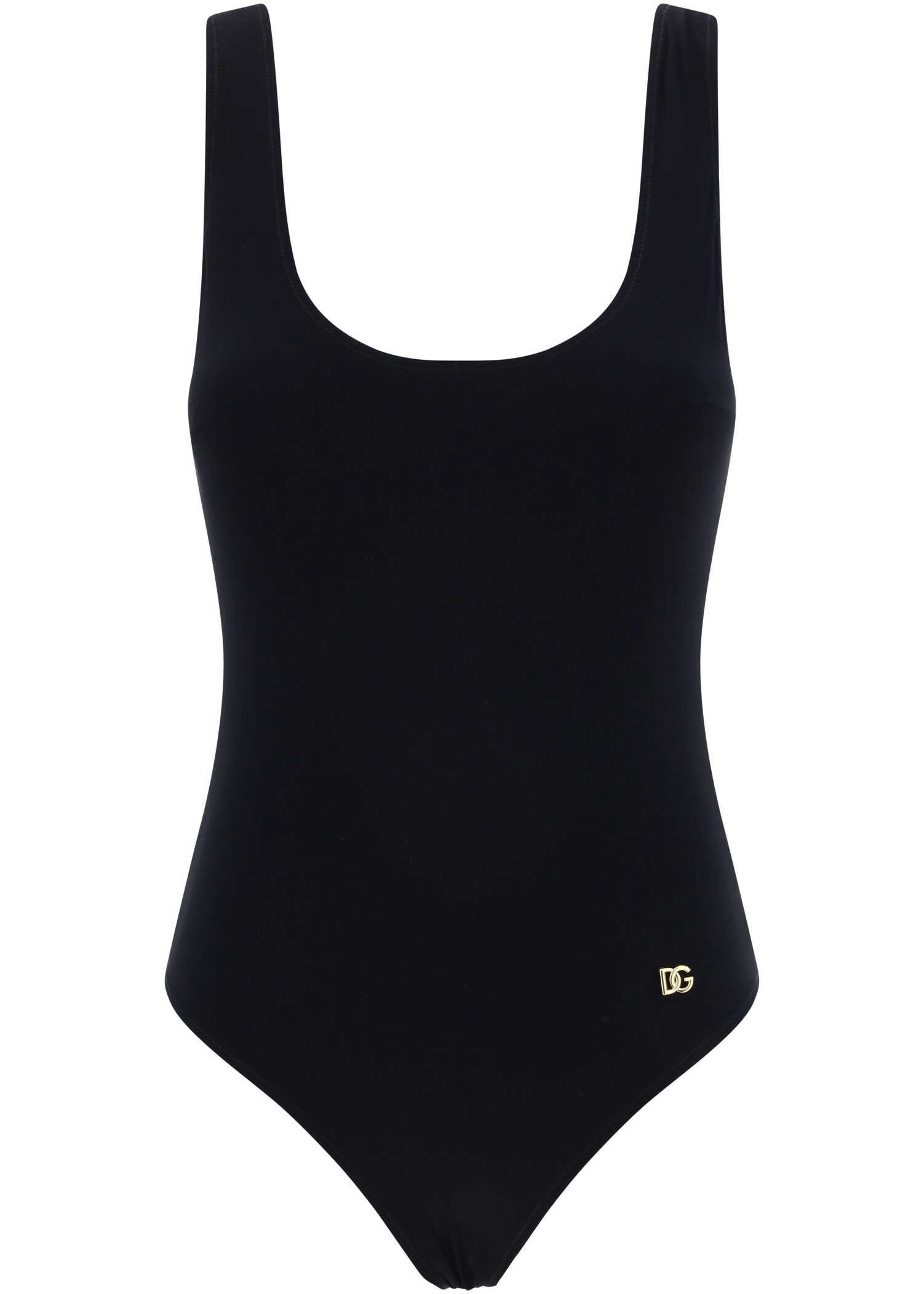 Swimsuit by Dolce&gabbana, one-piece model, classic straps, monochrome pattern, U-neck on the back, golden plaque with iconic DG logo applied on the front.