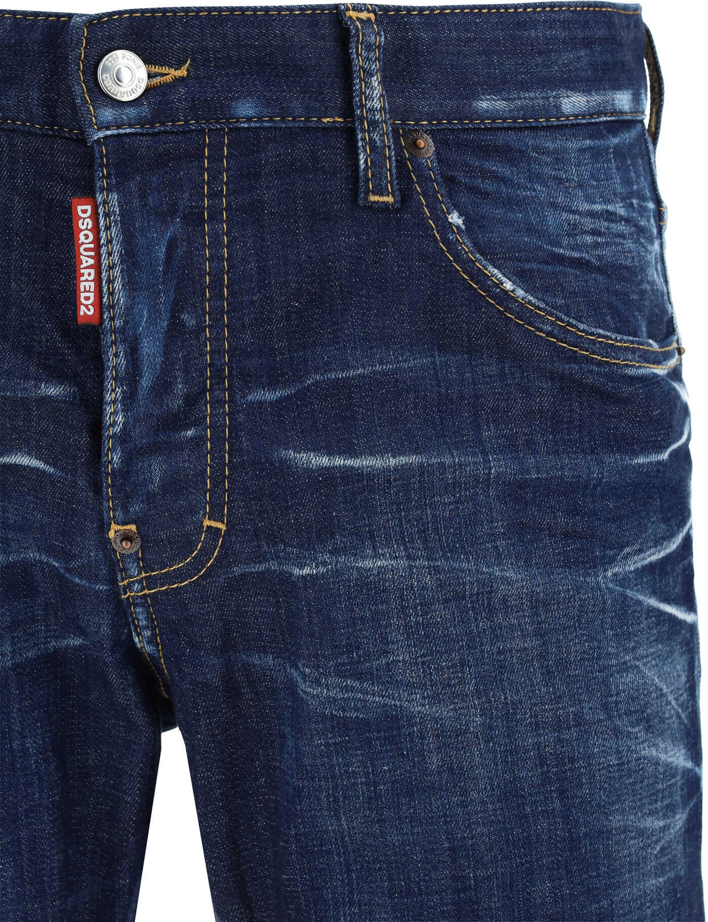Cotton Skater Jeans by Dsquared2, five-pocket straight style, front button and zipper closure, belt loops for waistband, iconic leather patch with brand signature pressure-printed applique on back.
