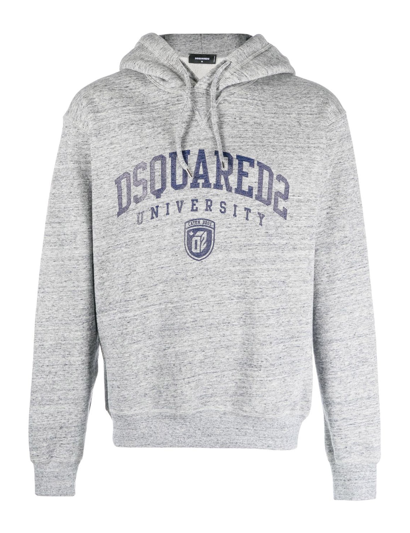 Dsquared2 relaxed-fit sweatshirt with college-style front print. Made from melange cotton jersey with fleece lining, it is finished with ribbed cuffs and hem. The model is 187 cm tall and wears a size L.