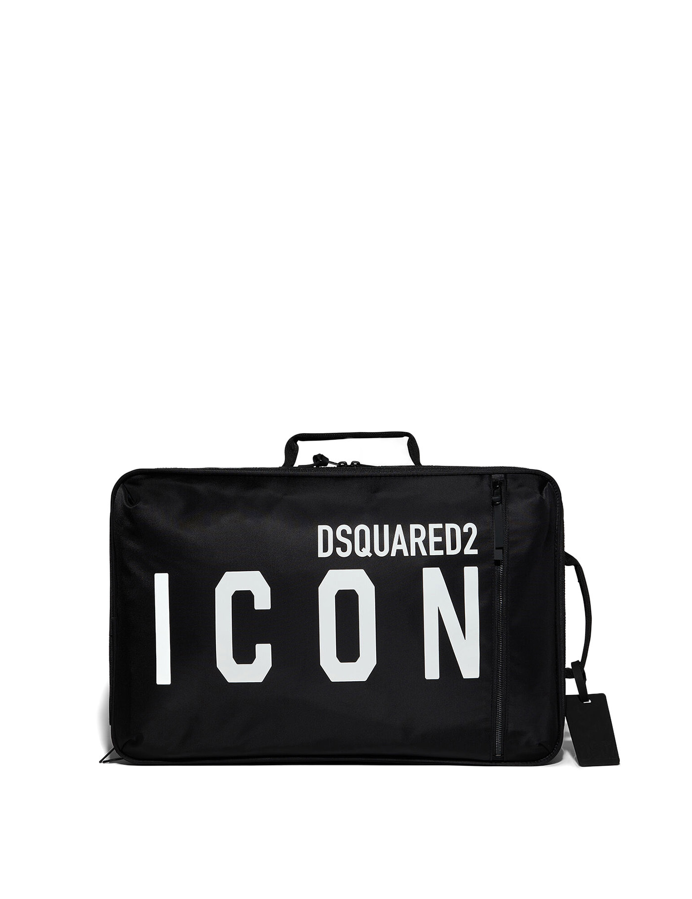 Be Icon trolley by Dsquared2 made of nylon and polycarbonate in shades of black. Contrasting ICON logo on the front and embossed logo on the back. Interior with mesh compartments, zip closure and front compartment with slip pockets. Upper and side handles in fabric, adjustable handle. Measures 57x35x19 cm.