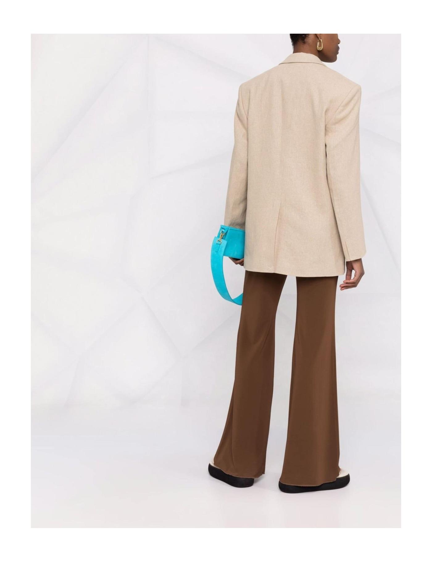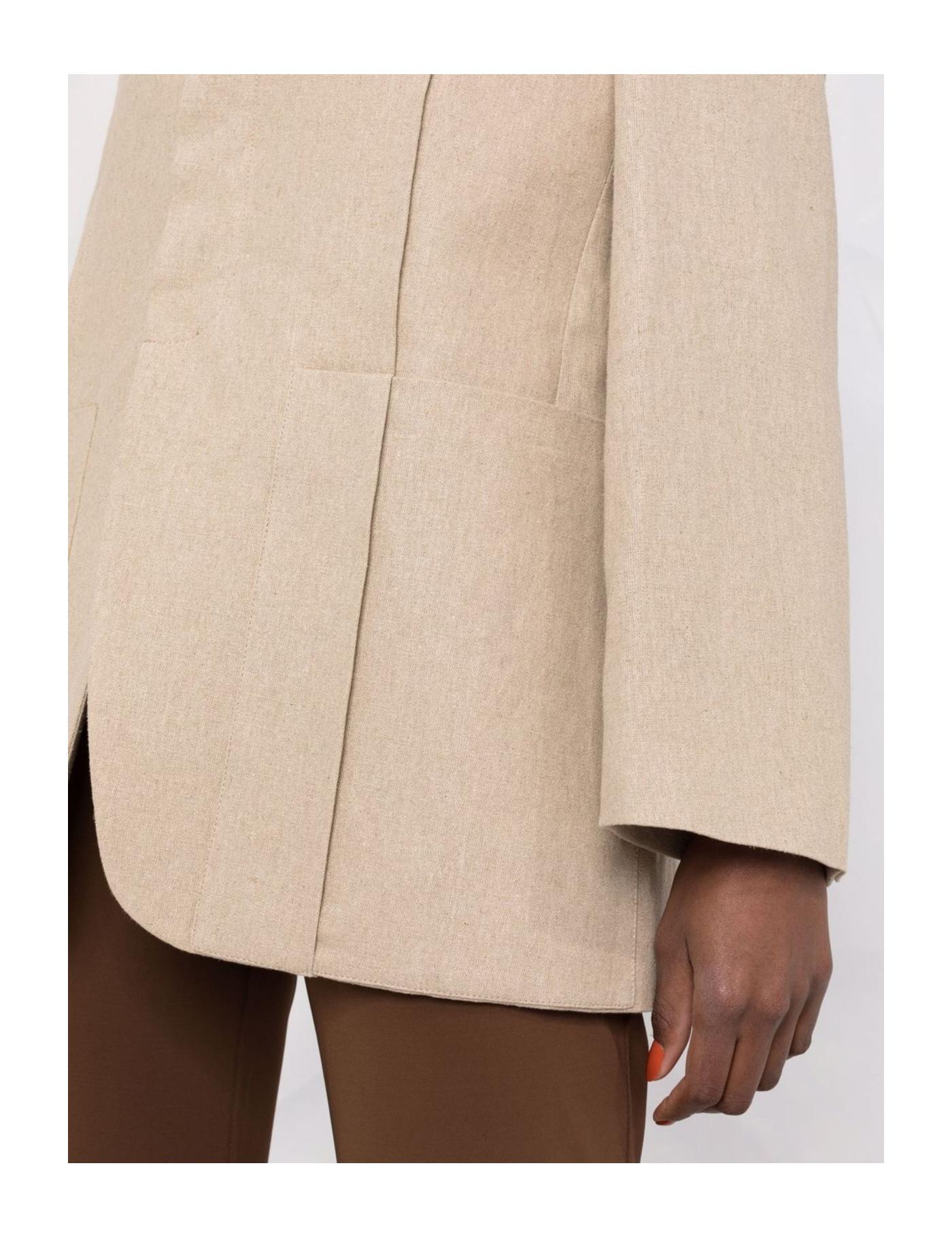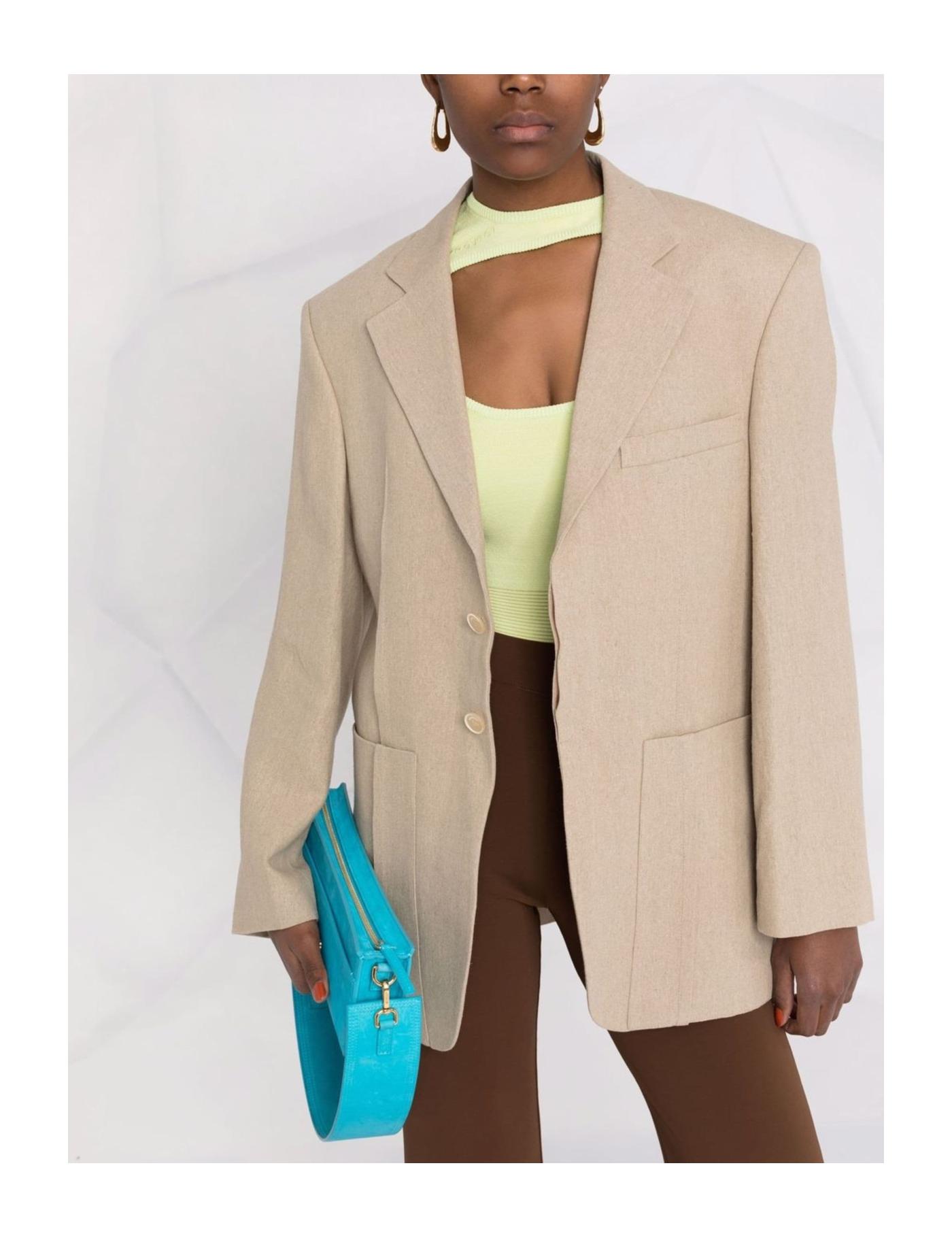 Jacquemus remains dedicated to bringing their twist to typical tailoring, and this blazer jacket from the SS22 collection is proof of that. Inspired and designed with a bulkier silhouette in mind, this garment has an oversized shape and pleat detailing towards the front.