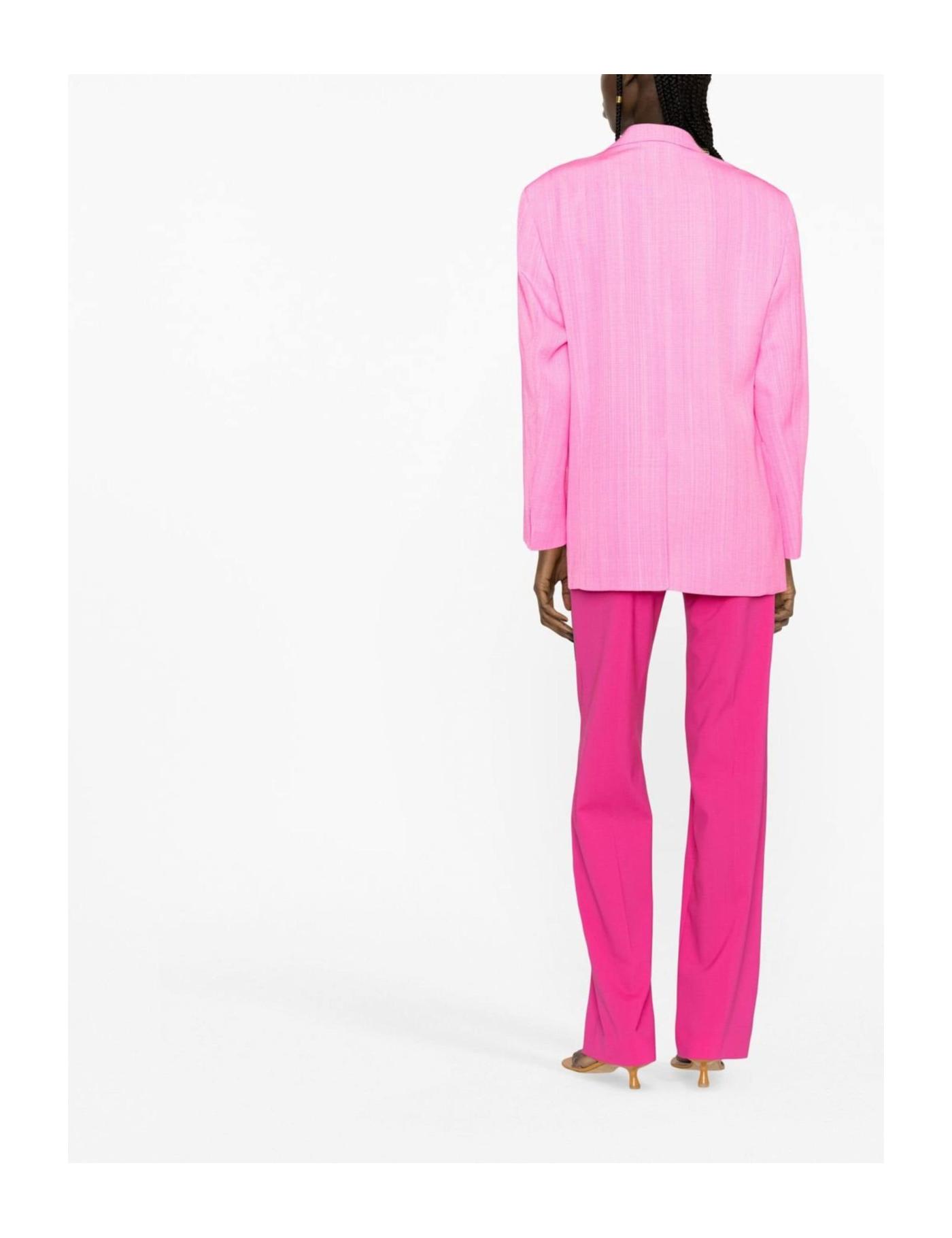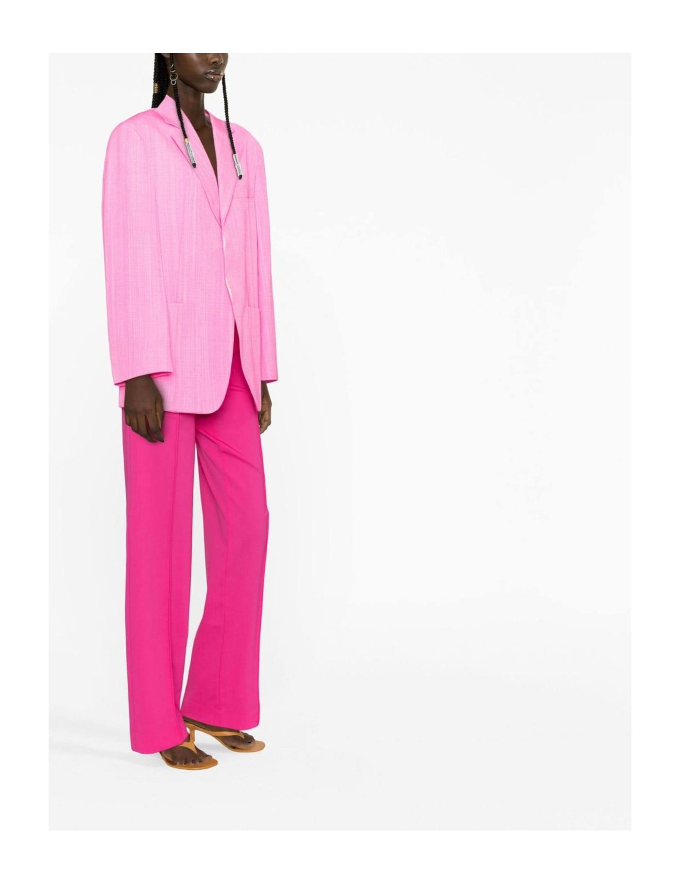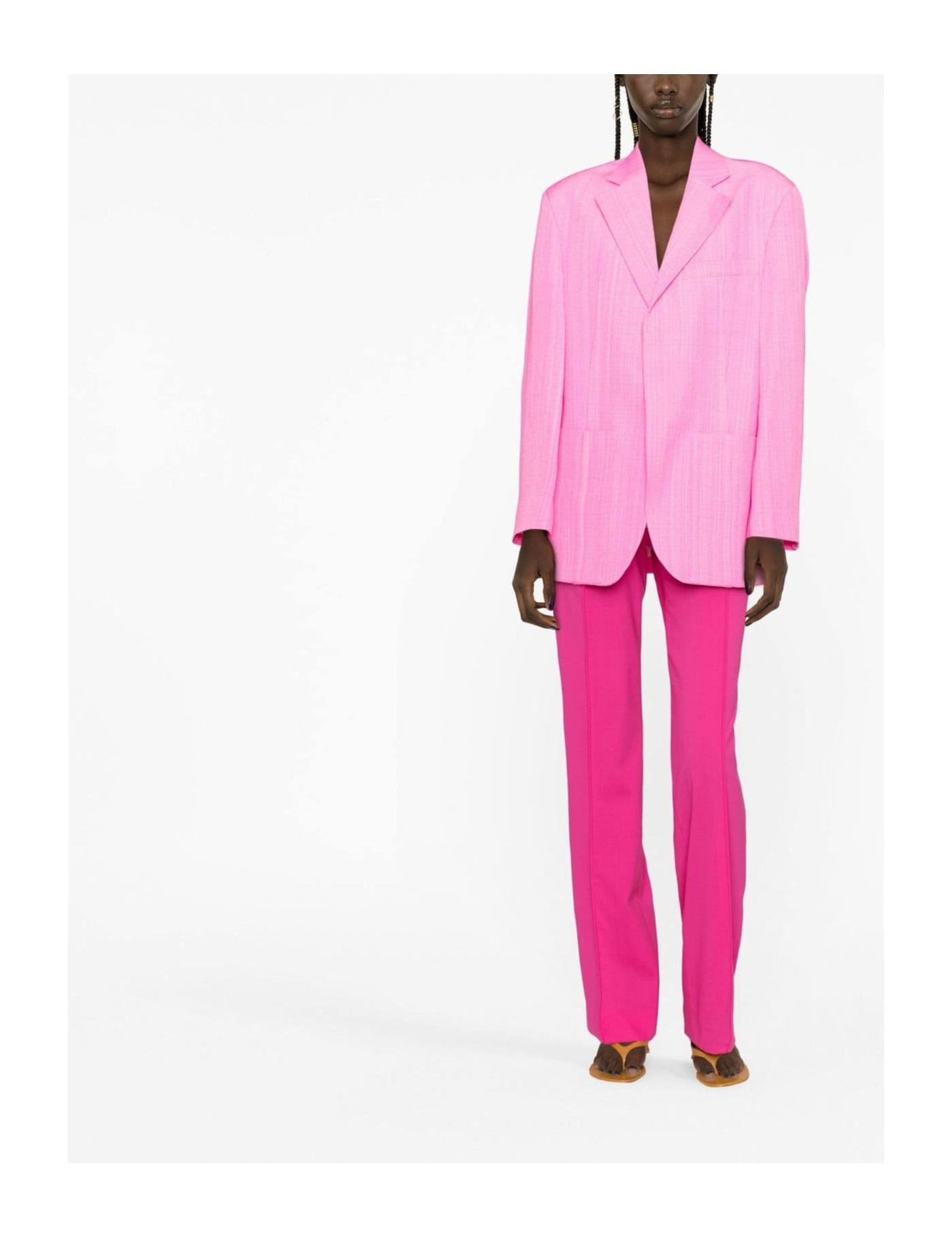 - single-breasted blazer from Jacquemus featuring bubblegum pink, notched collar, notched lapels, front button fastening, chest welt pocket and two side patch pockets.