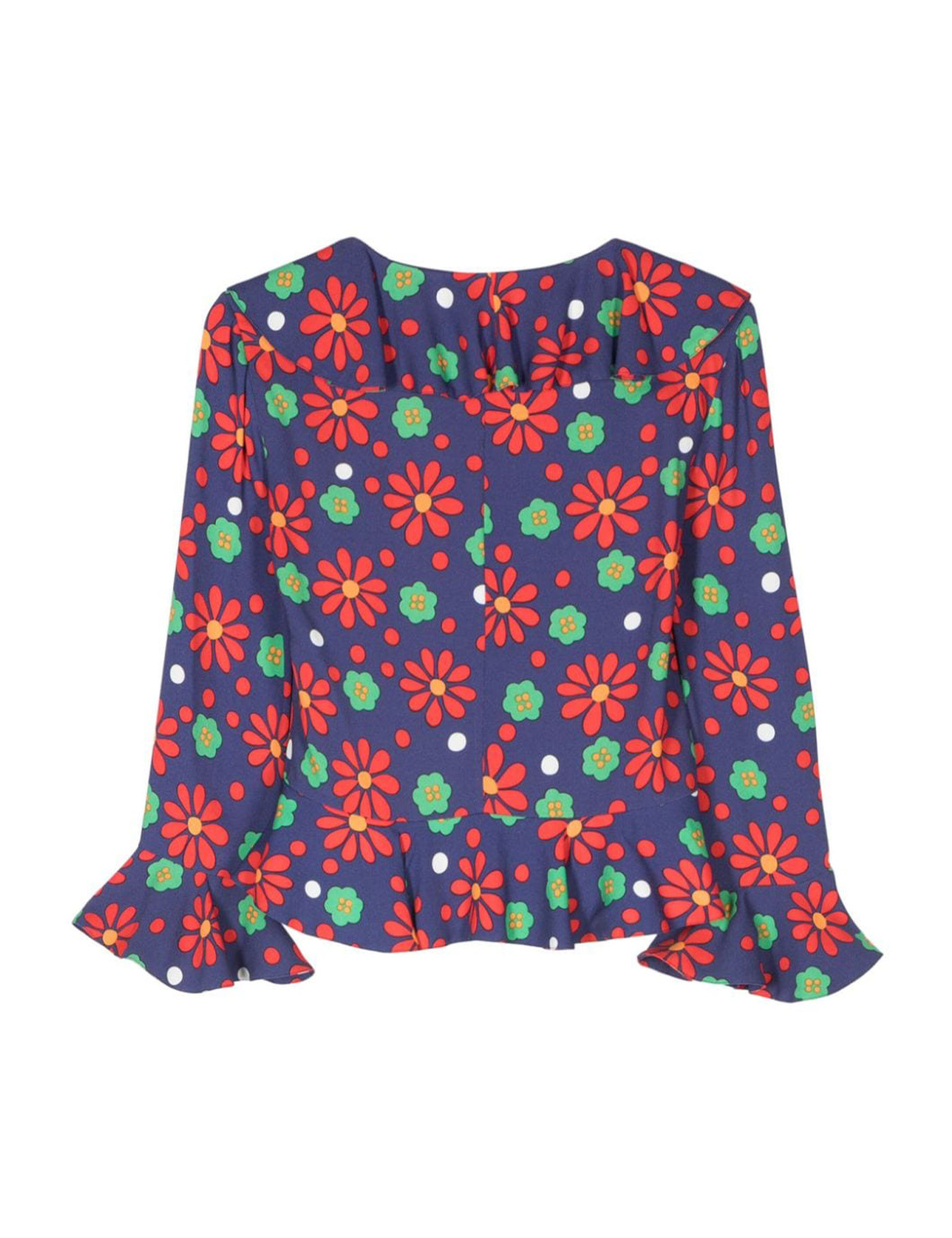 Blue/red/green floral-print ruffled blouse from SAINT LAURENT featuring all-over floral print, ruffled detailing, V-neck, front button fastening, long sleeves, flared cuffs and asymmetric hem.