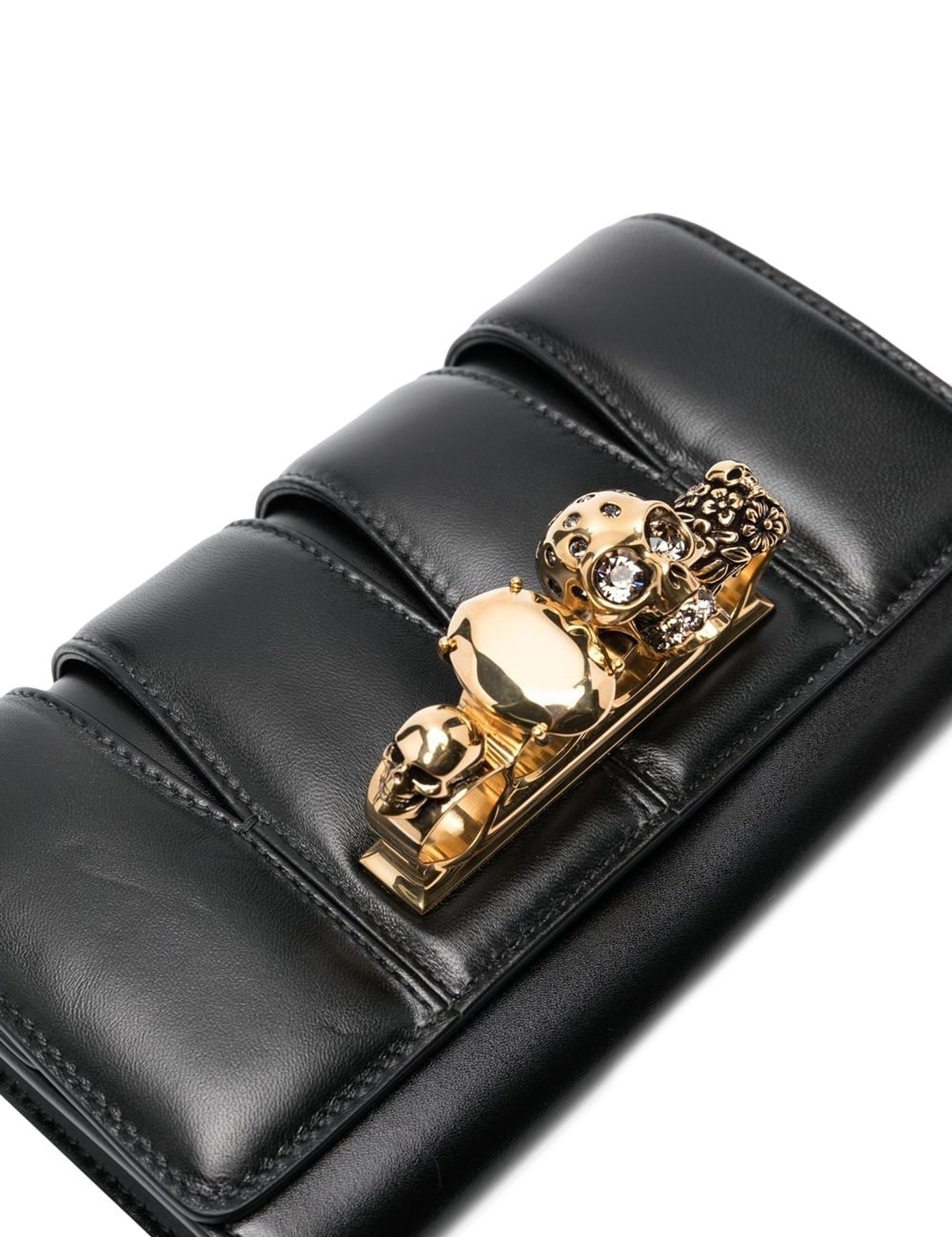 ALEXANDER MCQUEEN LEATHER SLASH SHOULDER BAG, ALL-OVER PADDED DESIGN, TOP FLAP WITH CUT-OUT DETAILS, FRONT FLAP WITH MAGNETIC BUTTON CLOSURE, SINGLE INTERIOR COMPARTMENT, ICONIC JEWELED SKULL HANDLE ON FRONT, REMOVABLE CHAIN STRAP.