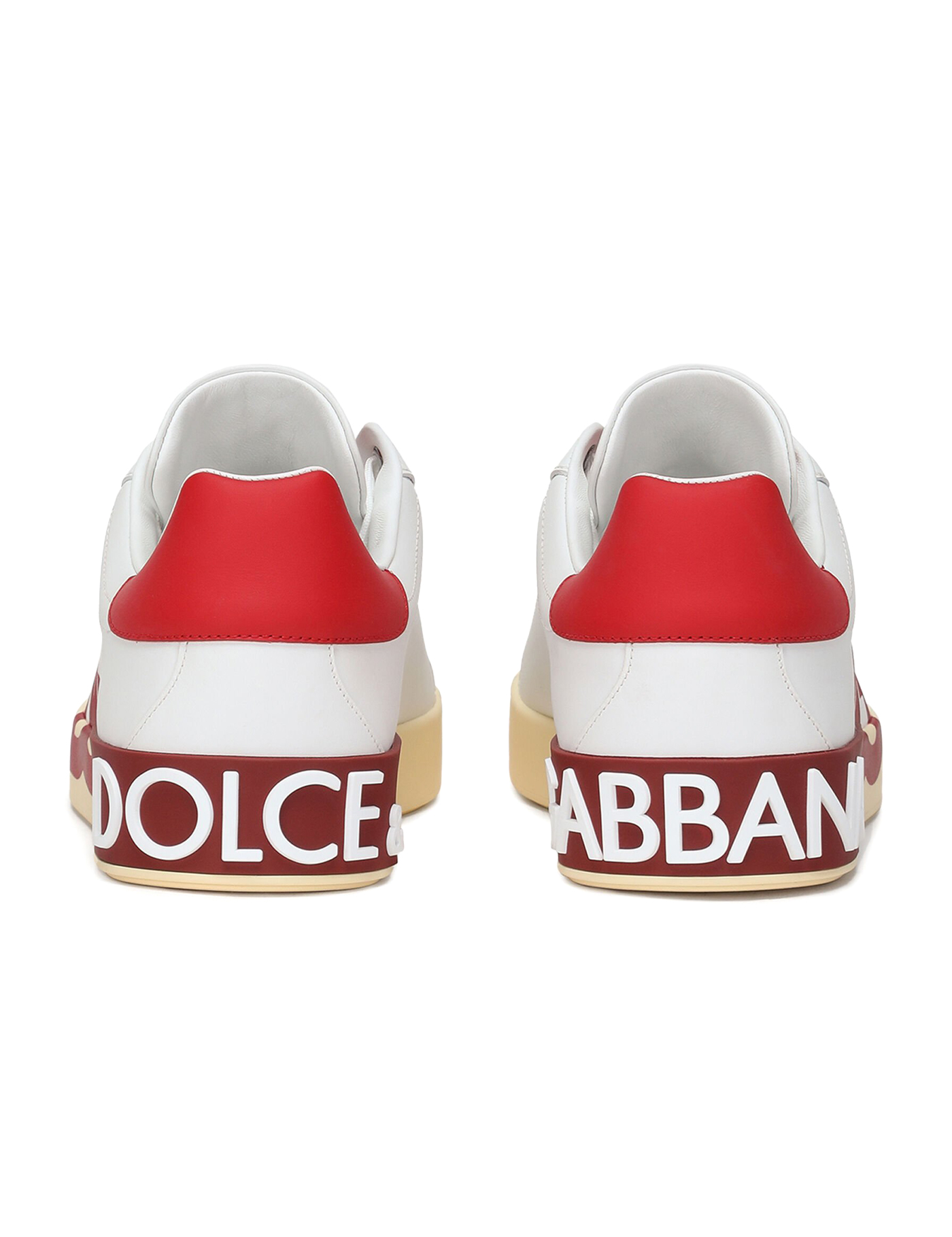 Wine red, cloud white, leather, side logo print, front lace-up closure, round toe and flat rubber sole.