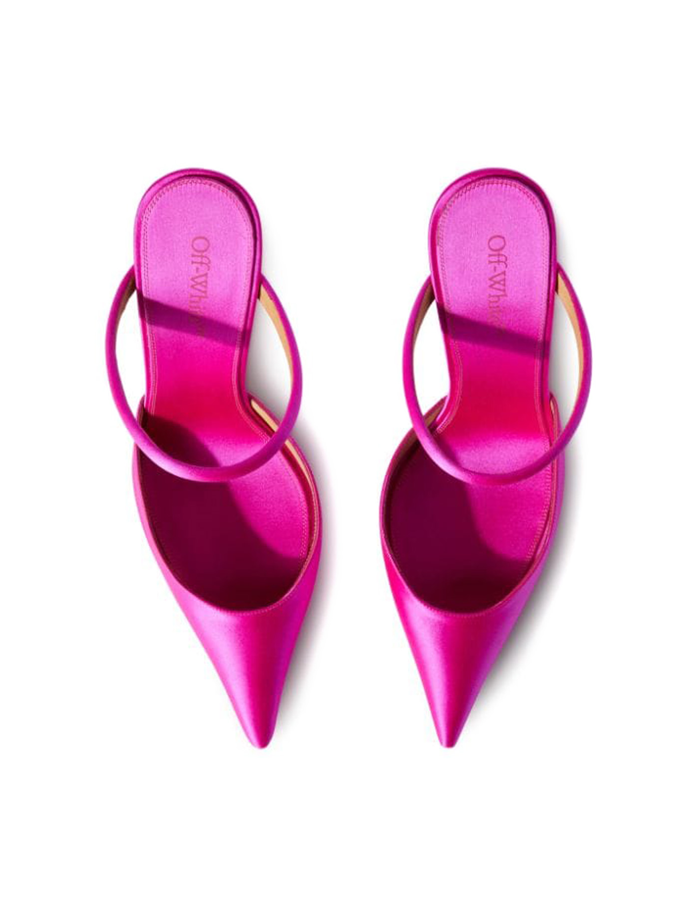 110mm pointed-toe mules from OFF-WHITE featuring hot pink, calf leather, satin finish, bead detailing, thin straps, pointed toe, branded footbed, slip-on style and high heel.