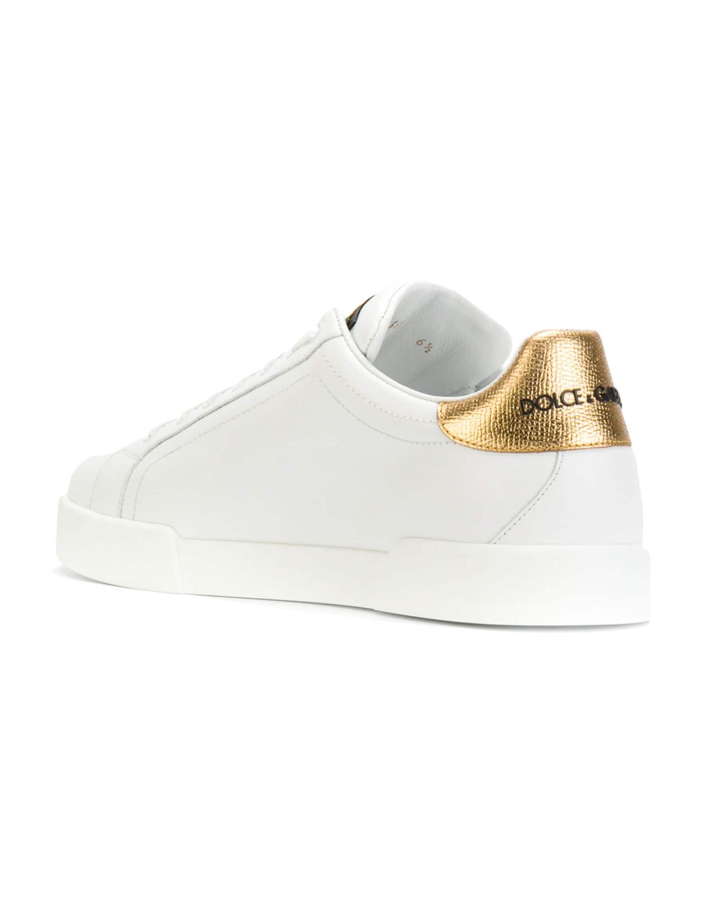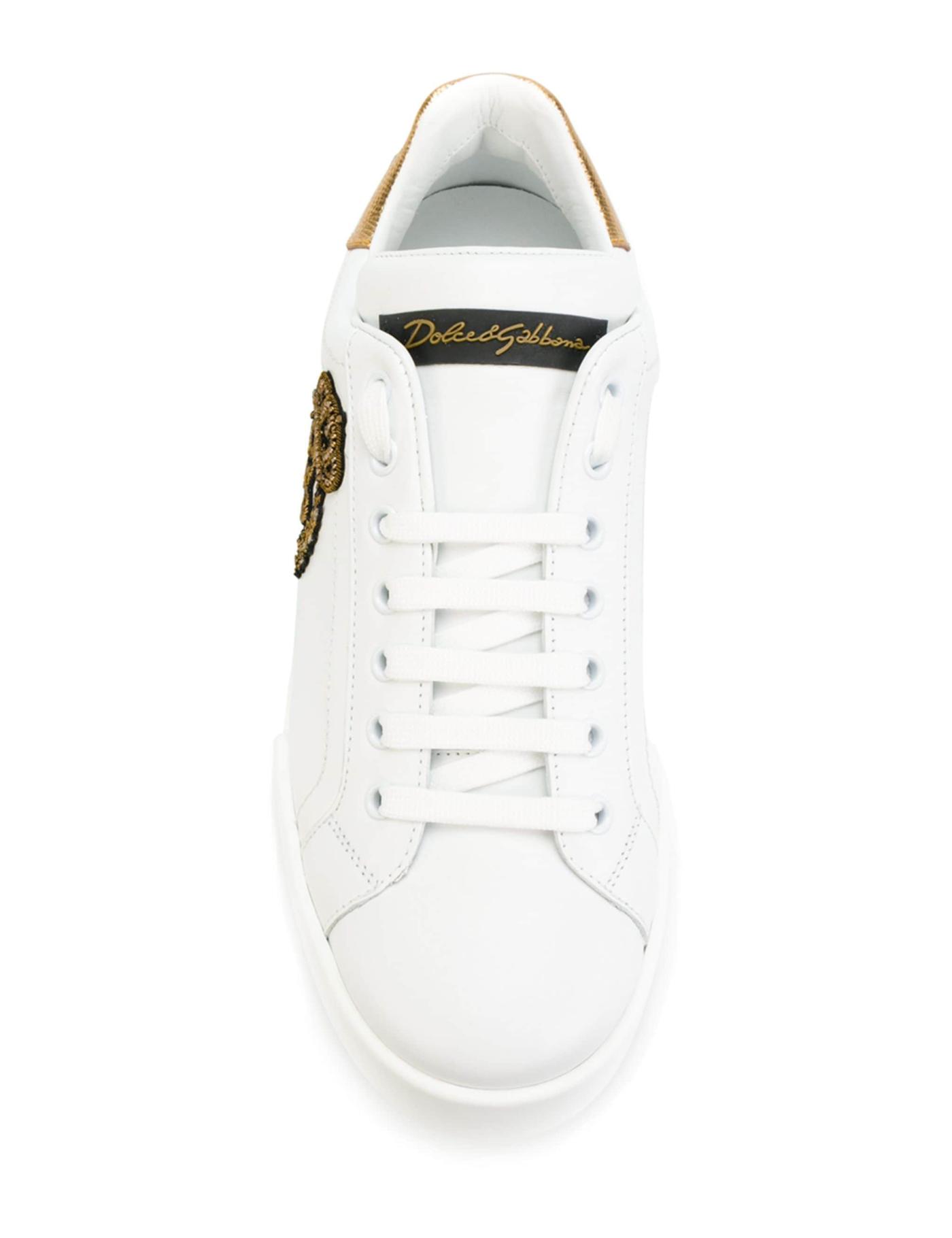 - There's no need to compromise comfort over style. Enjoy both with these Portofino calf leather sneakers from Dolce & Gabbana. You really can have it all. Featuring a round toe, a lace-up front fastening, a flat rubber sole, a logo patch at the tongue, a printed logo to the rear, embroidered details and a contrasting heel counter.