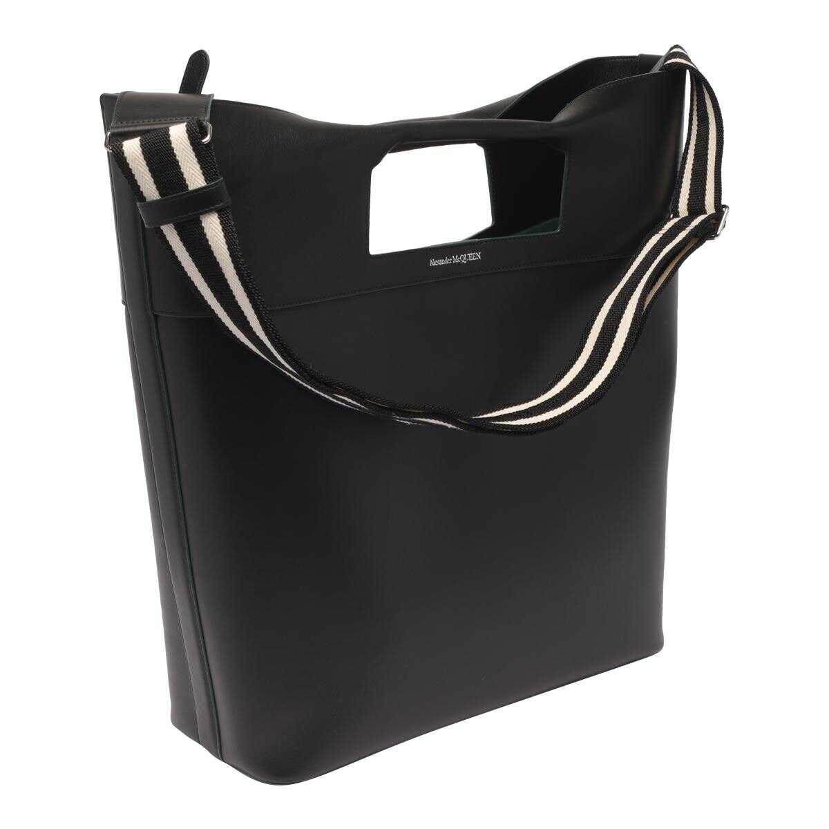 leather logo print tote bag from Alexander McQueen featuring black, calf leather, smoothing finish, stripe detailing, logo print to the front, bow detailing, two top handles, single top handle and main compartment.