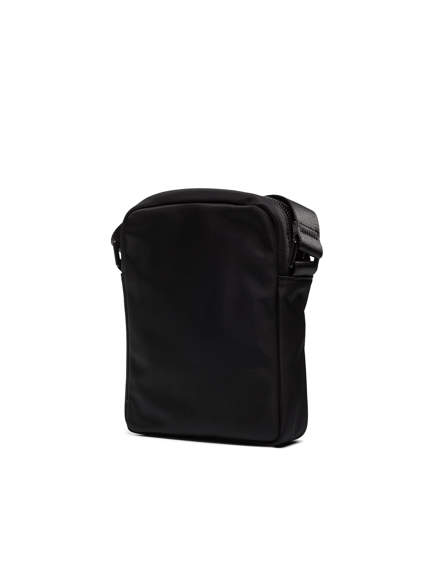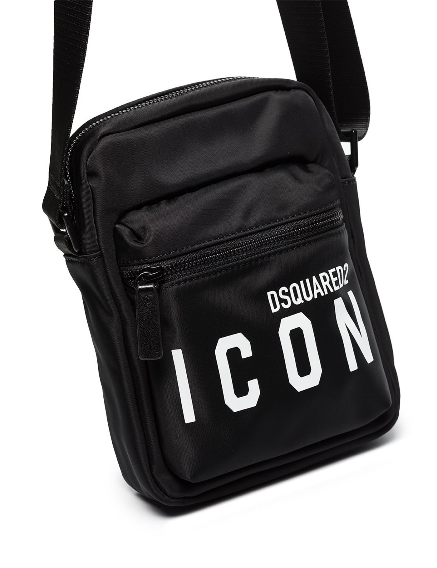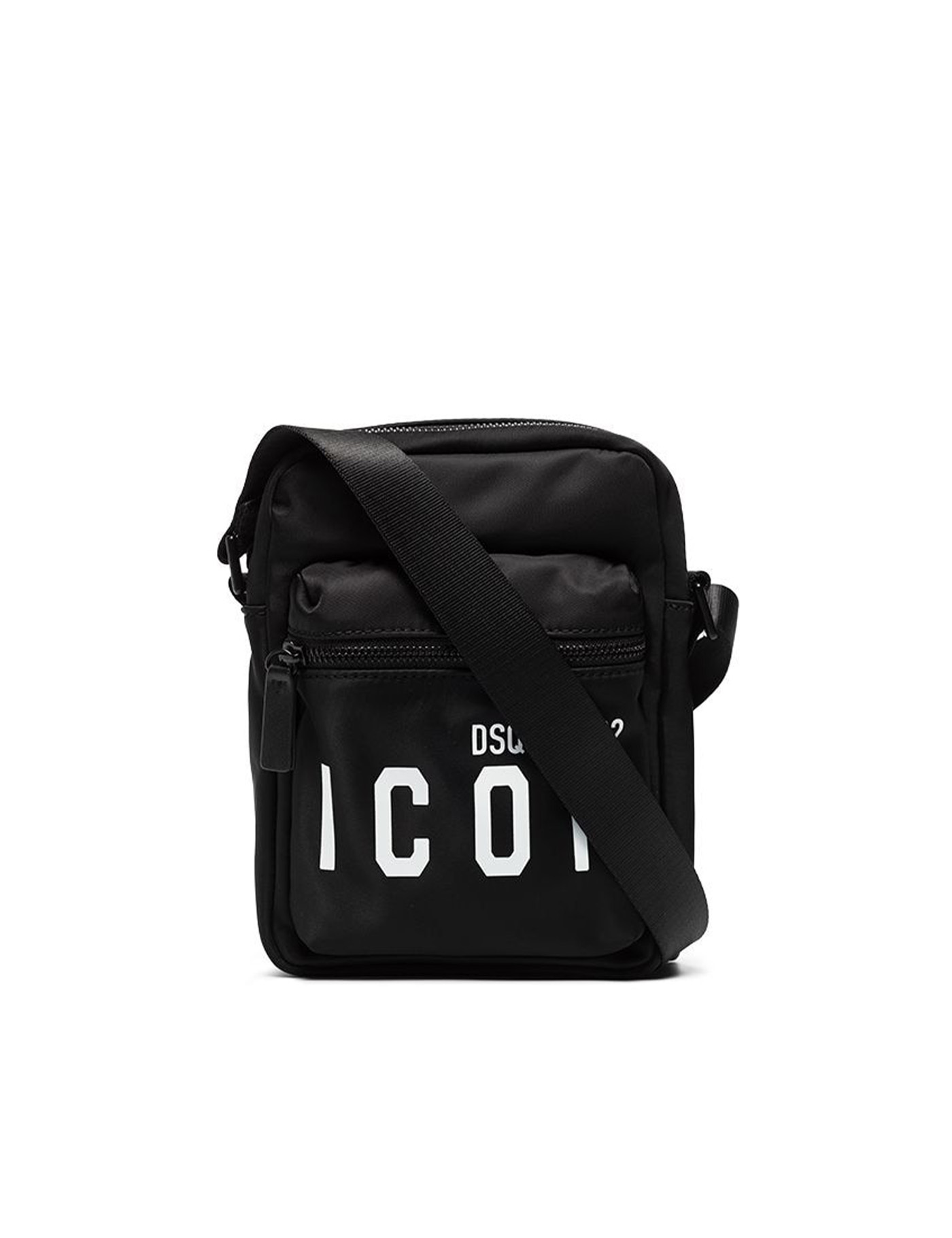 Be Icon crossbody bag by Dsquared2 made of black nylon, decorated with contrasting logo print on the front. It features two zipped compartments, one with slip pockets, and an adjustable fabric shoulder strap. Measures 22x16x5.5 cm.