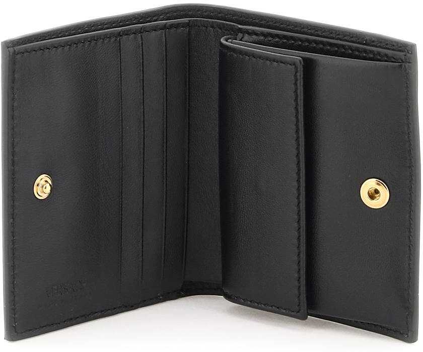 Leather wallet by Versace with iconic Greca Goddess in gold-plated metal. Interior with one bill compartment, ina coin pocket and three credit card slots.