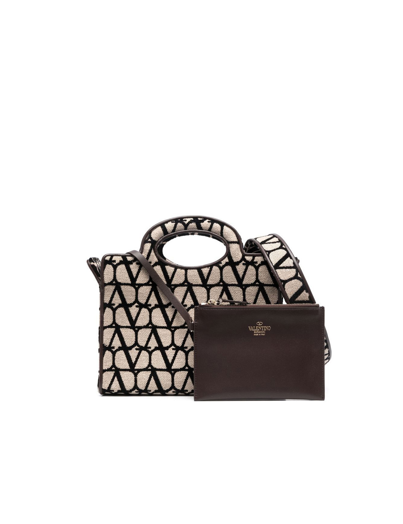 Le Troisième Toile Iconographe leather tote bag from VALENTINO GARAVANI featuring black, beige, calf leather, canvas, two flat top handles, adjustable detachable shoulder strap, open toe, main compartment, removable pouch and signature Toile Iconographe pattern. DEPTH: 12.0 Centimetres HANDLE: 7.0 Centimetres HEIGHT: 19.0 Centimetres STRAP: 52.0 Centimetres WIDTH: 26.0 Centimetres