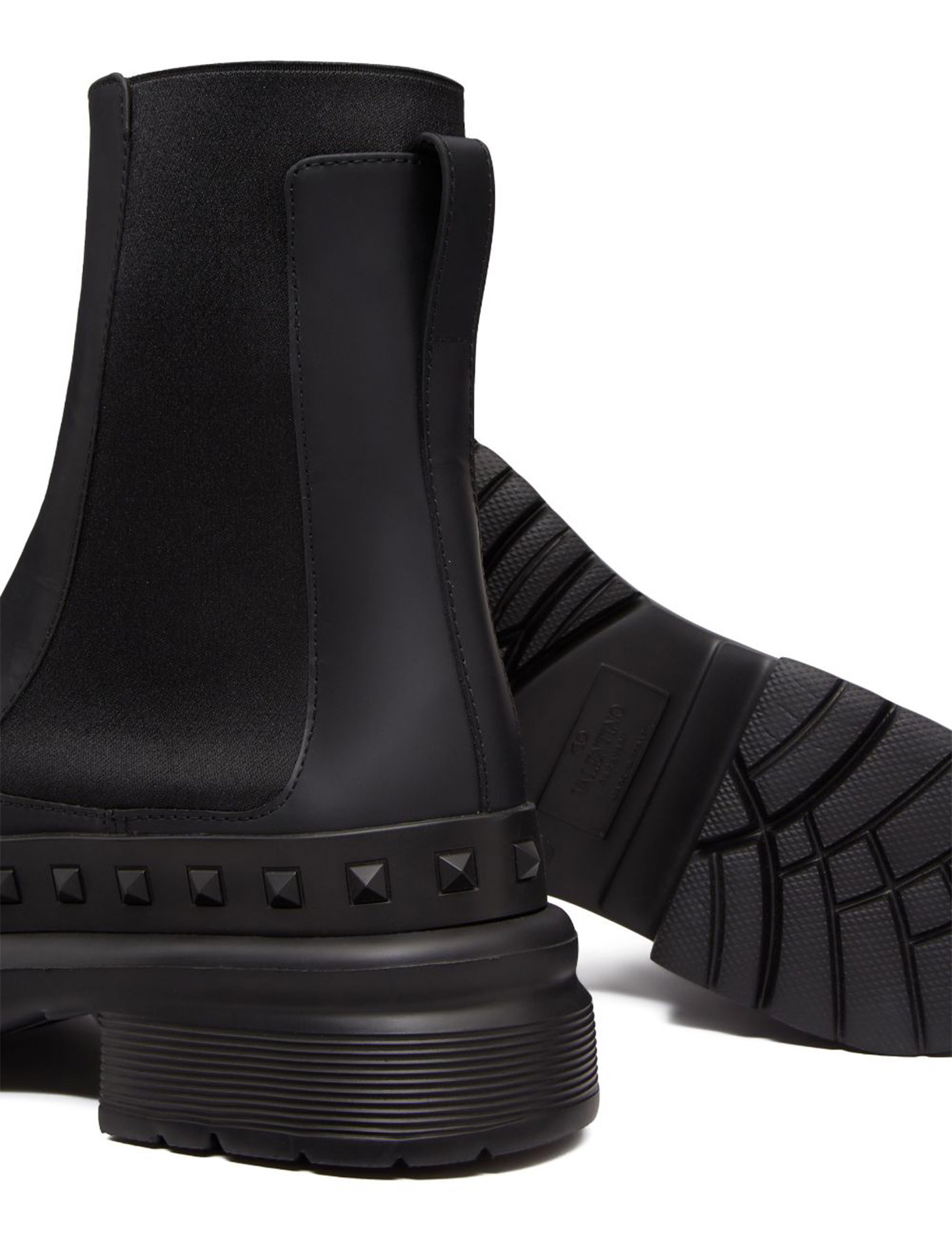 Rockstud M-Way ankle boots by Valentino Garavani in matte leather decorated with embossed tone-on-tone studs along the welt. Side elastic inserts, back pull tab, leather interior, rubber sole.