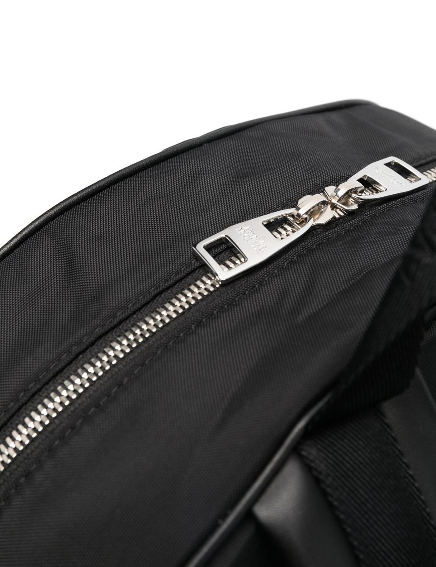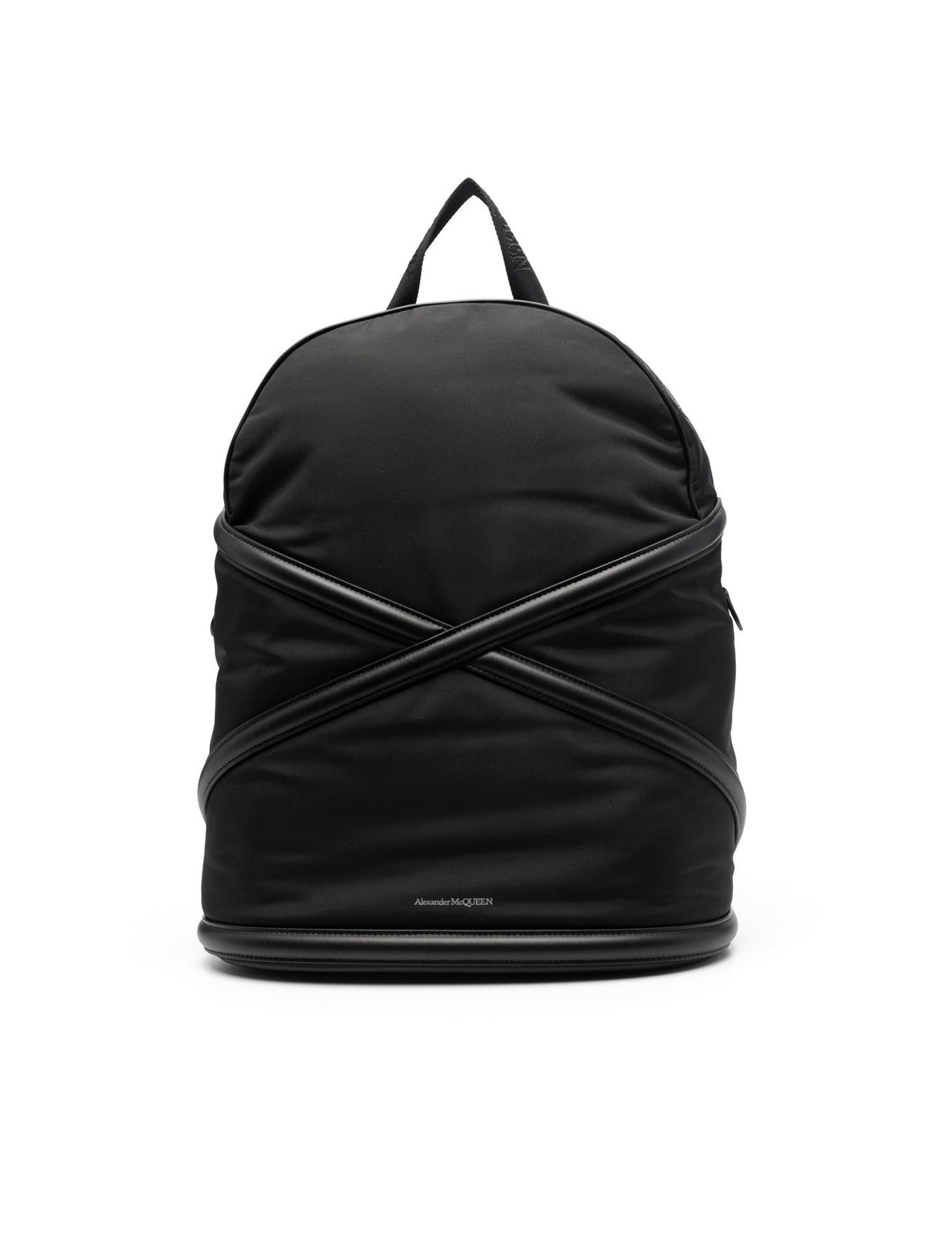 Alexander McQueen nylon Harness backpack with tone-on-tone leather harness and contrasting printed lettering logo on front. Two-way zipper closure, contrasting nylon-lined interior with one laptop pocket and one flat pocket. Padded and adjustable leather shoulder straps with logoed webbing. Silver-finished metalware.