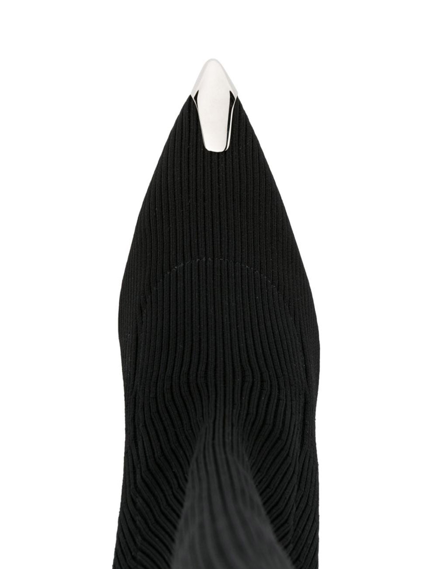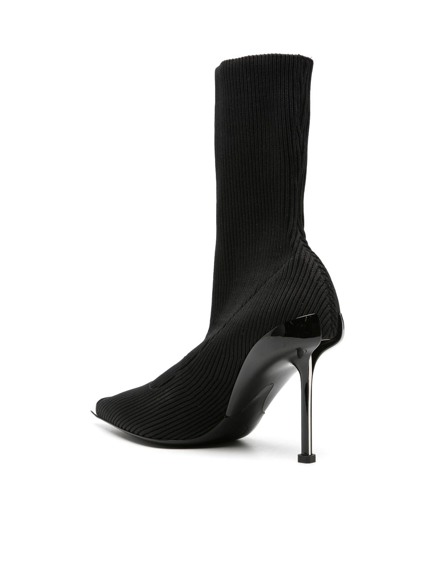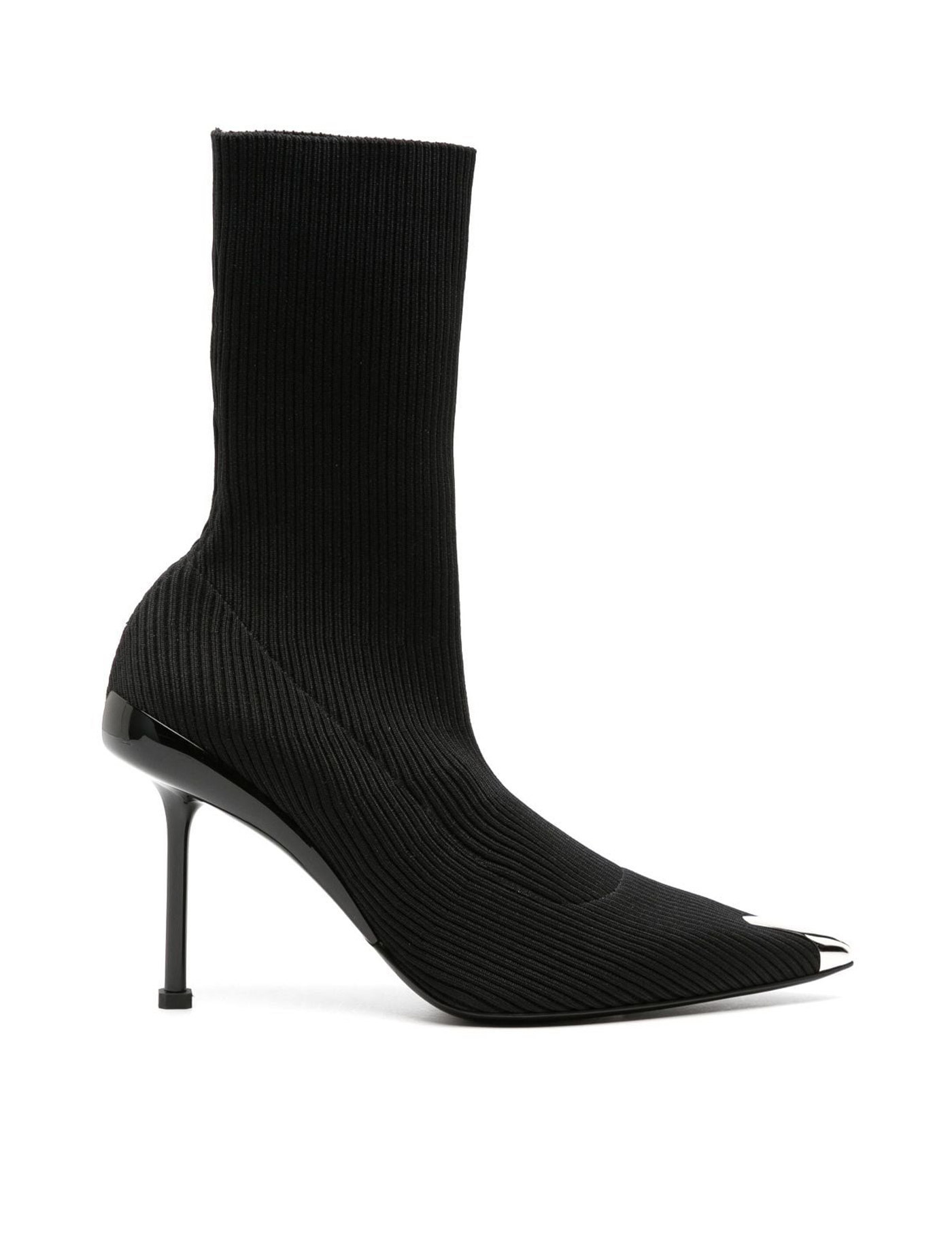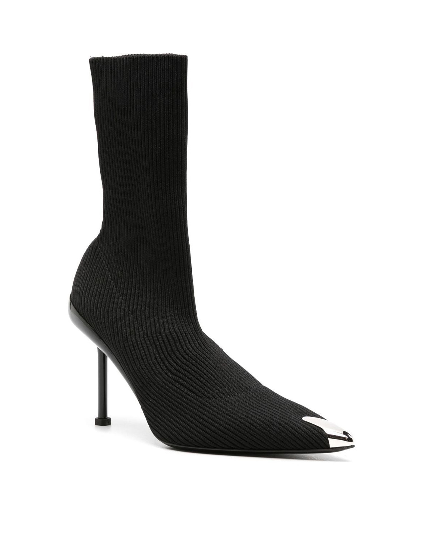 Alexander McQueen Slash knit ankle boots with silver metal detail on toe. Leather insole, lacquered heel with cut-out and silver metal exposed core, leather sole with rubber inlay.