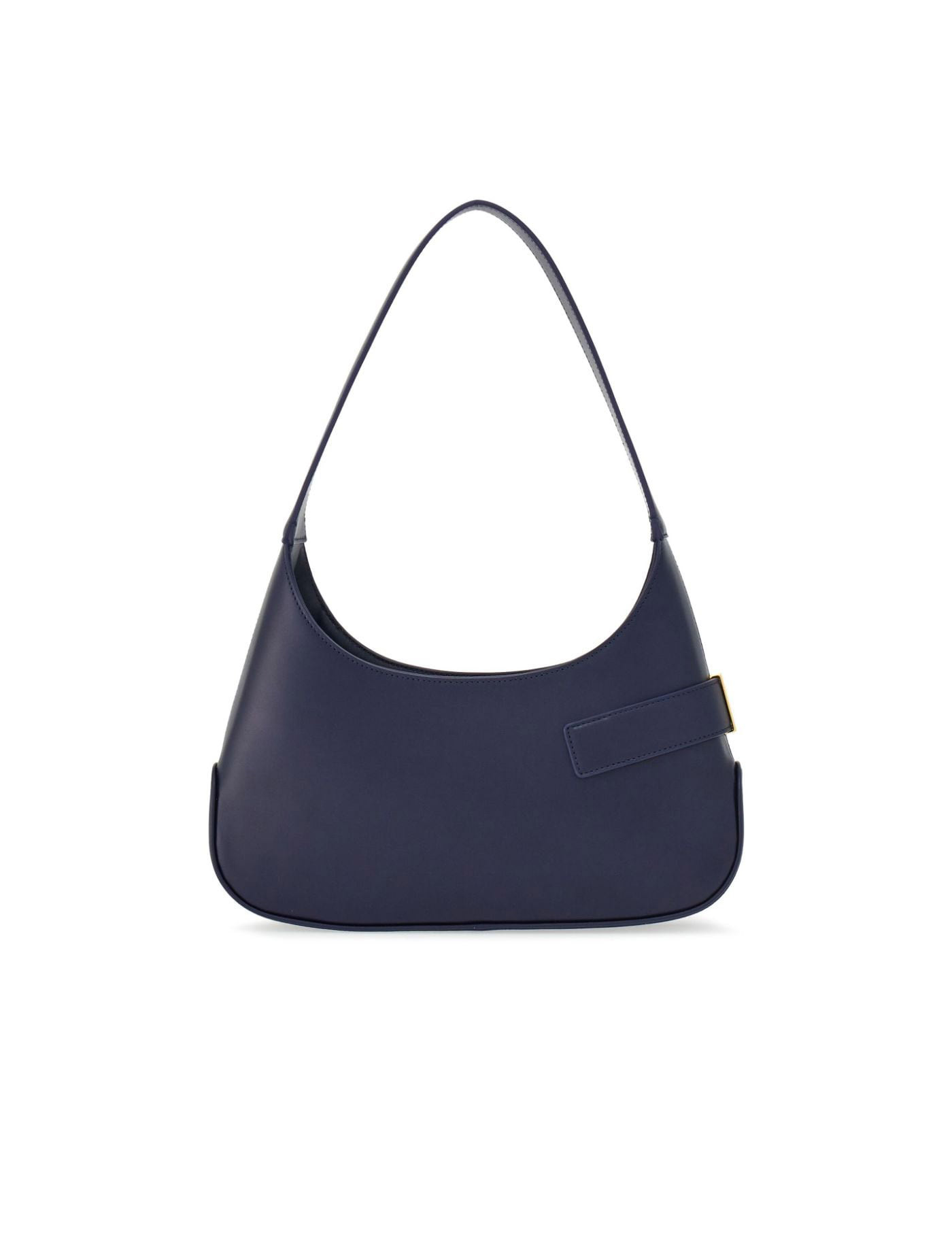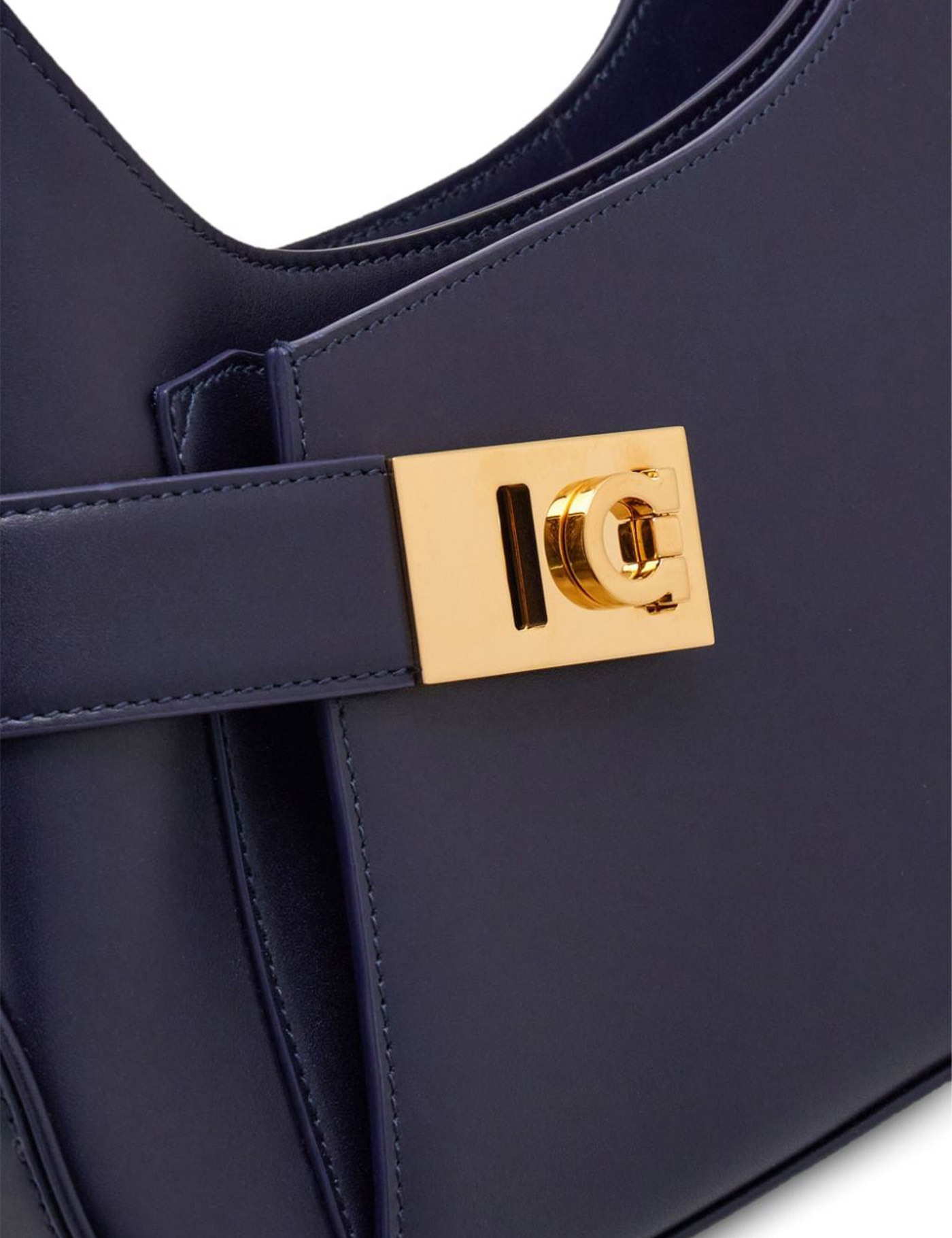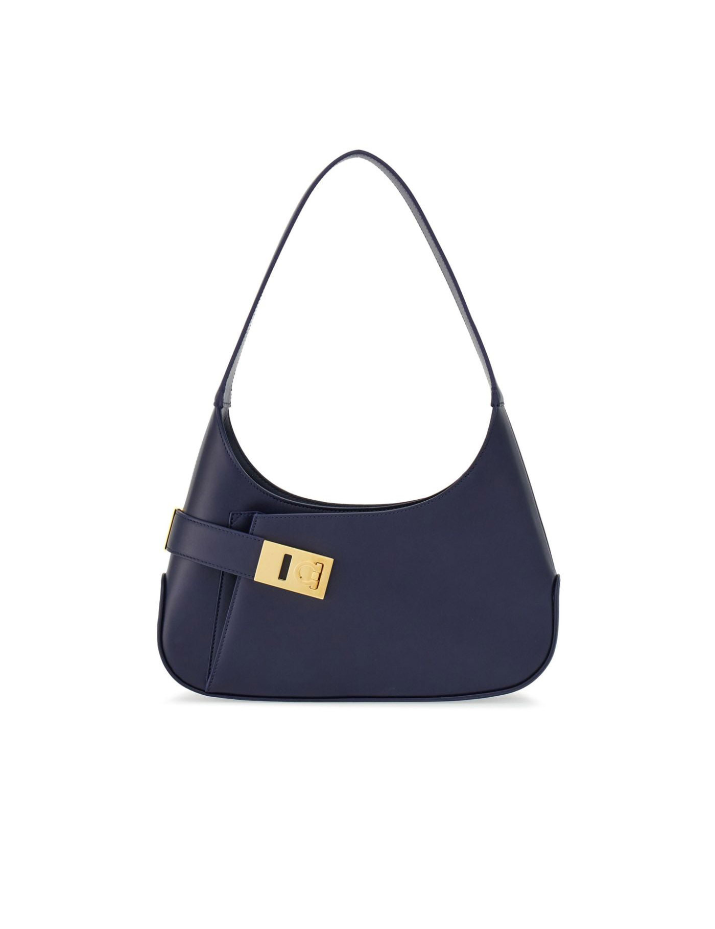 Midnight blue calf leather gold-tone hardware gancini buckle tonal stitching top zip fastening single shoulder strap main compartment internal card slots internal logo stamp front patch pocket leather lining