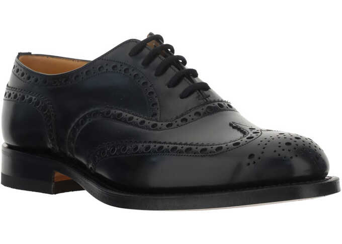 Calfskin Lace-up Shoes by Church's, elongated toe, front lace-up closure, slight leather block heel, shiny leather design with perforated detailing, logo-embossed insole.
