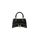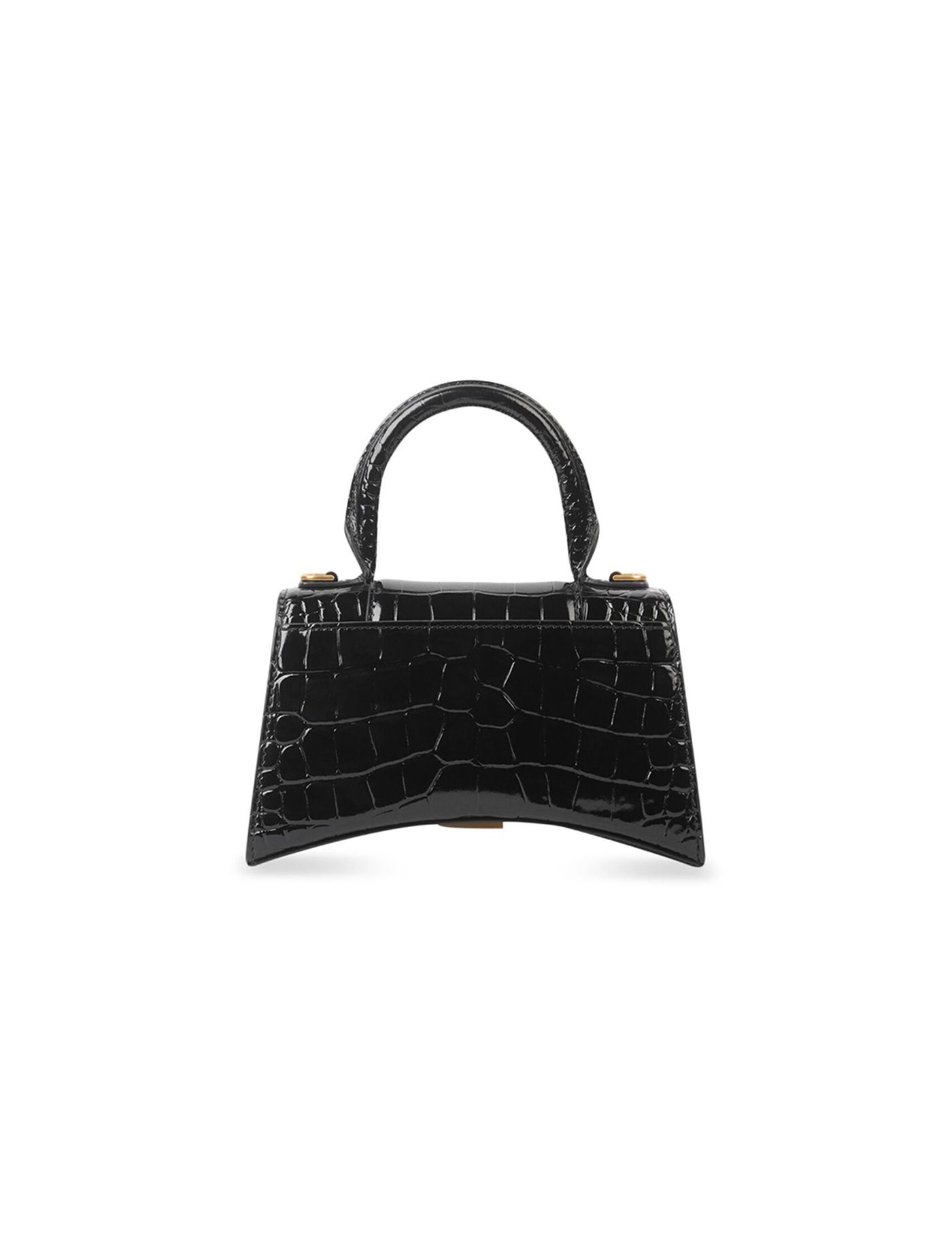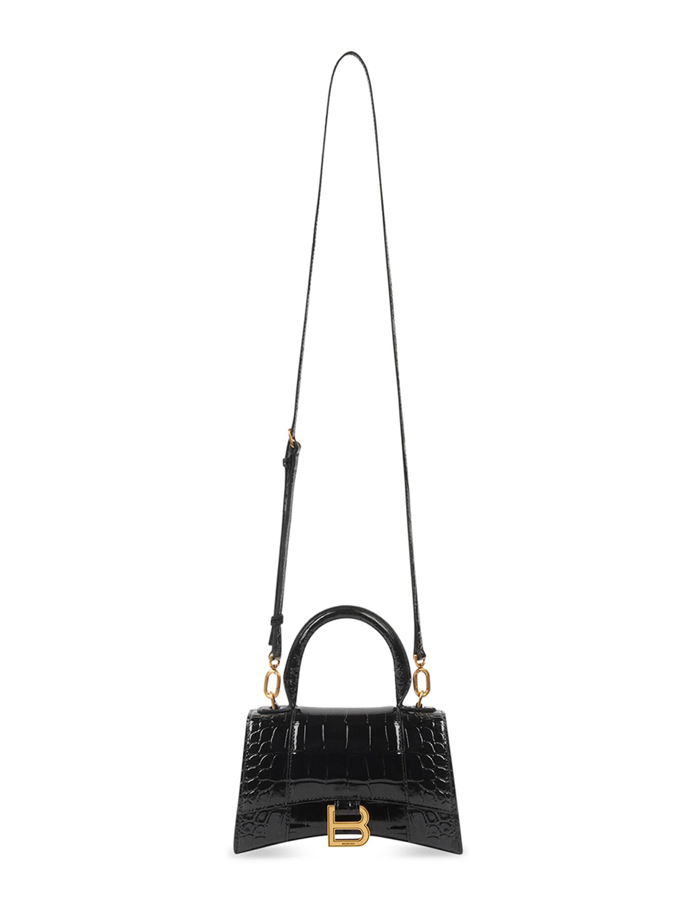 Calfskin Hourglass XS Handbag by Balenciaga, single top handle, concealed magnetic closure on front flap, adjustable and removable shoulder strap, iconic gold-plated and applied logo plaque on front, contrasting engraved logo inside, interior zipper pocket, croco-effect leather print.
