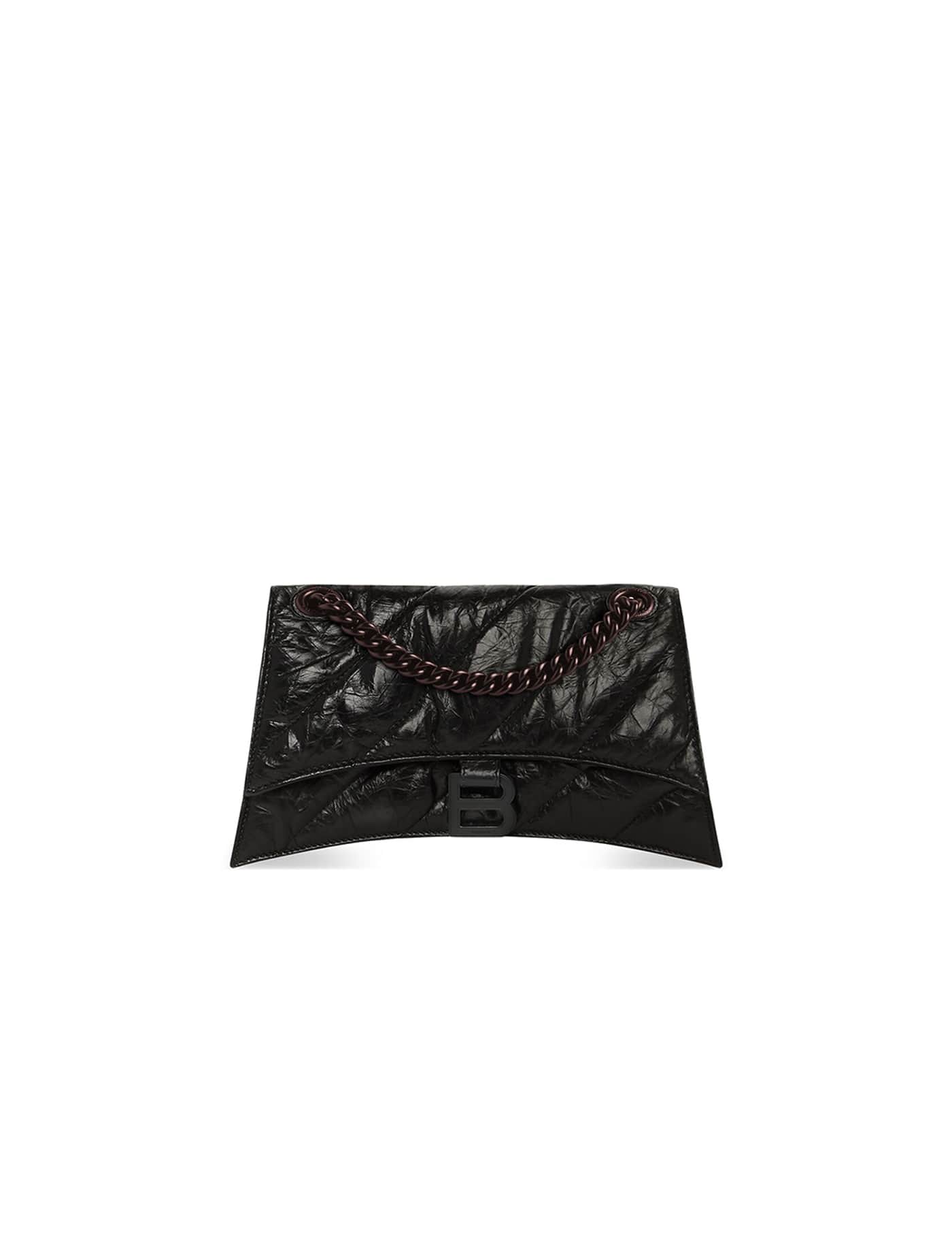Calfskin Crush Shoulder Bag by Balenciaga, front magnetic button closure, tone-on-tone iconic brand monogram plaque on front for closure, matching sliding chain strap, interior card slot, bill compartments, quilted and padded leather design.
