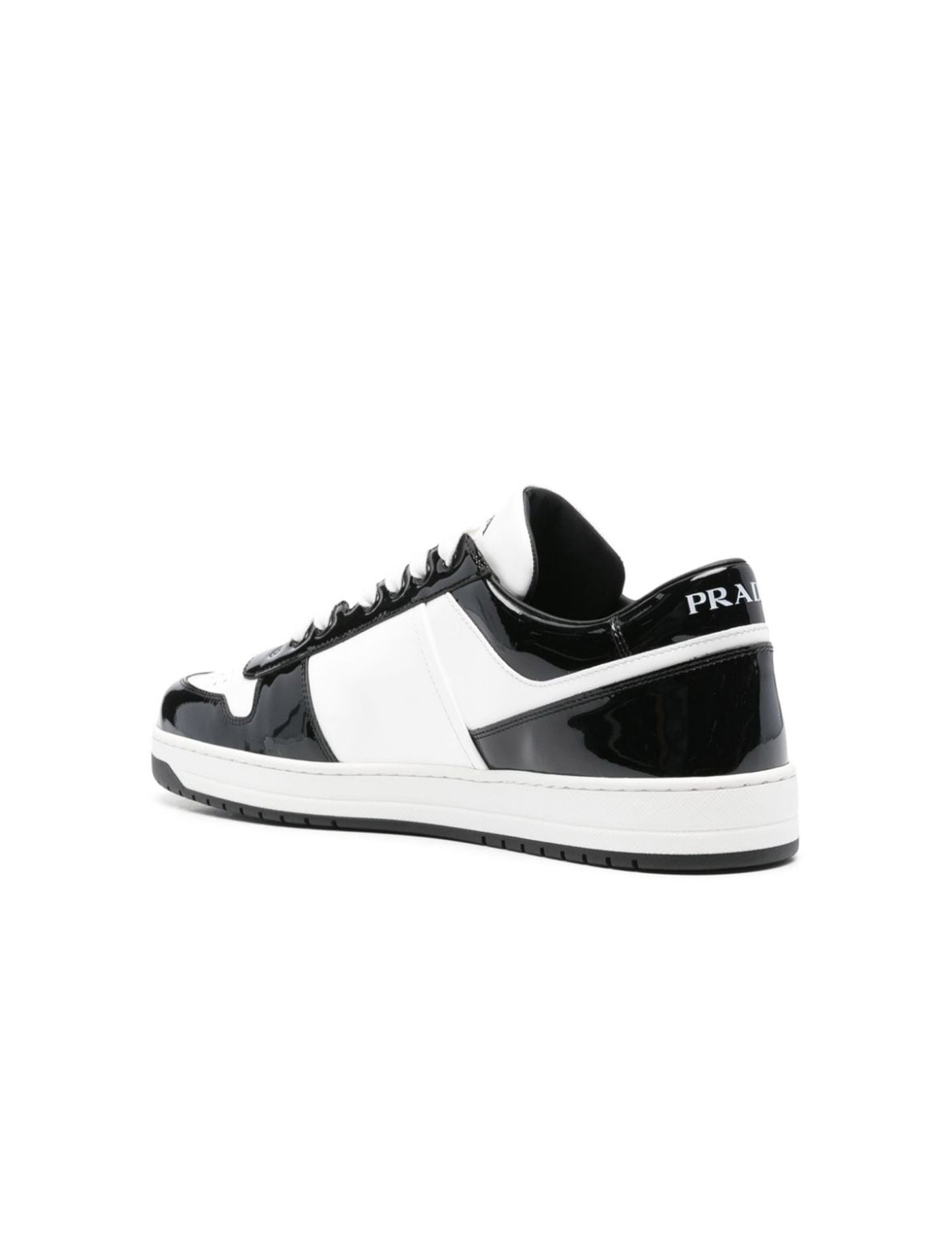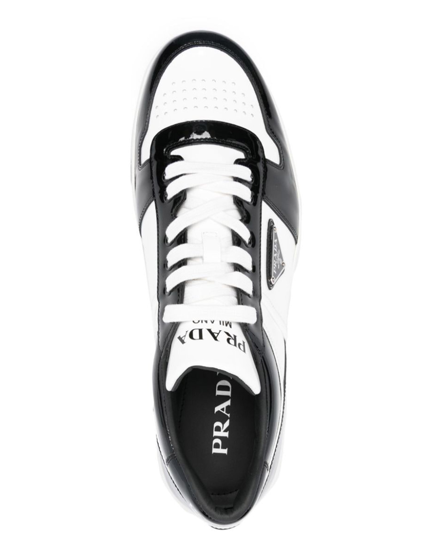 Calfskin Downtown Sneakers by Prada featuring a patent leather paneled design, a lace-up front closure, a round perforated toe, an iconic triangular brand signature plaque applied to the outer side panel, a contrasting logoed heel and front label, and a flat sole.
